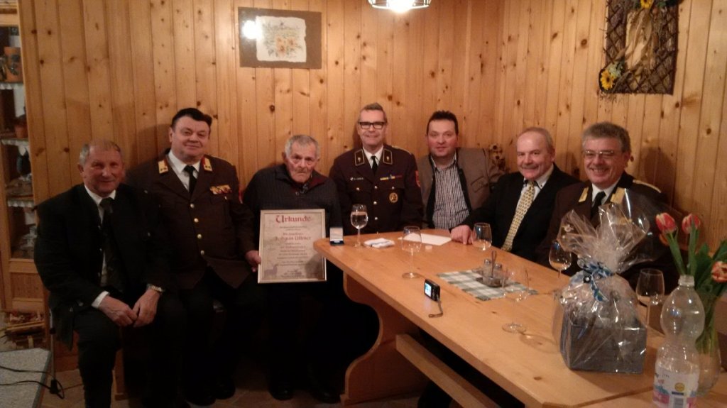 Eine Abordnung der FF Kleinhöflein gratulierte ihrem ältesten Mitglied und überreichte einen Geschenkkorb. Kommandant FT Robert Lehr hob in seiner Ansprache die Verdienste von EABI Johann Ullmer hervor. Er lenkte 28 Jahre lang als Kommandant die Geschicke der FF Kleinhöflein und erwarb sich auch im Abschnitt Retz Verdienste als Stellvertreter des Abschnittskommandanten.
