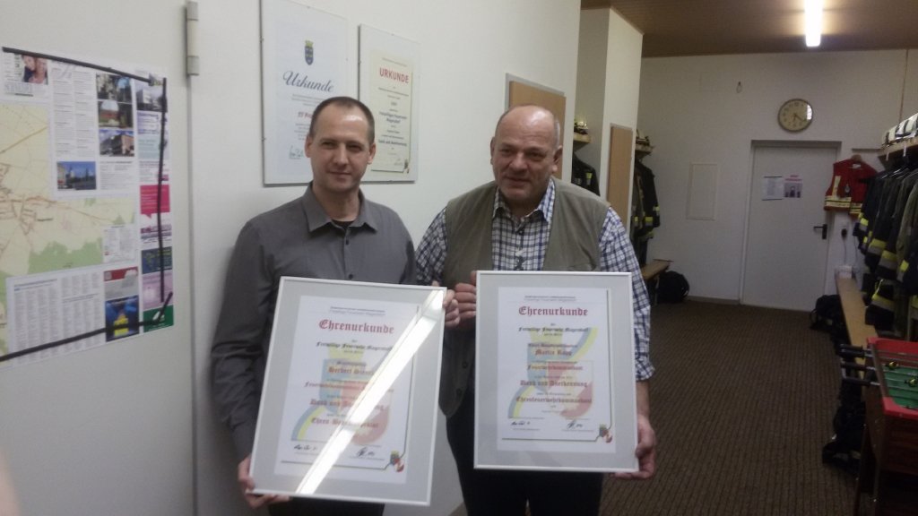 Foto2: OBI Herbert Sienel und EHBI Martin Rapp erhielten eine Urkunde als Dank für 20 Jahre Kommandoarbeit in der FF Magersdorf