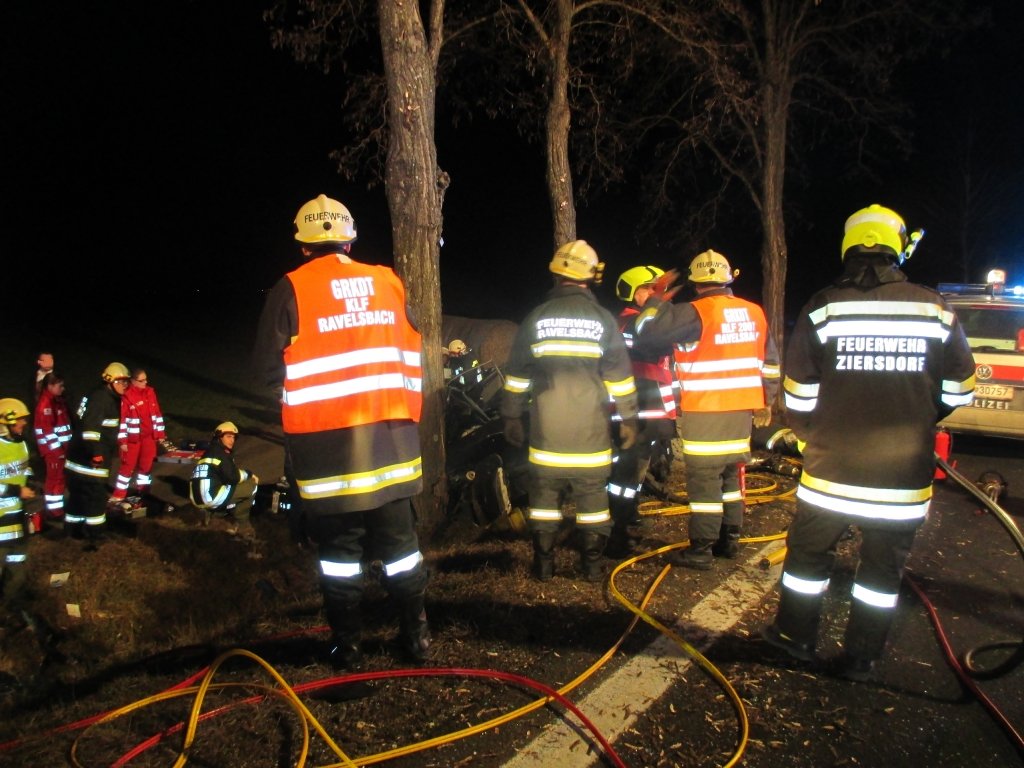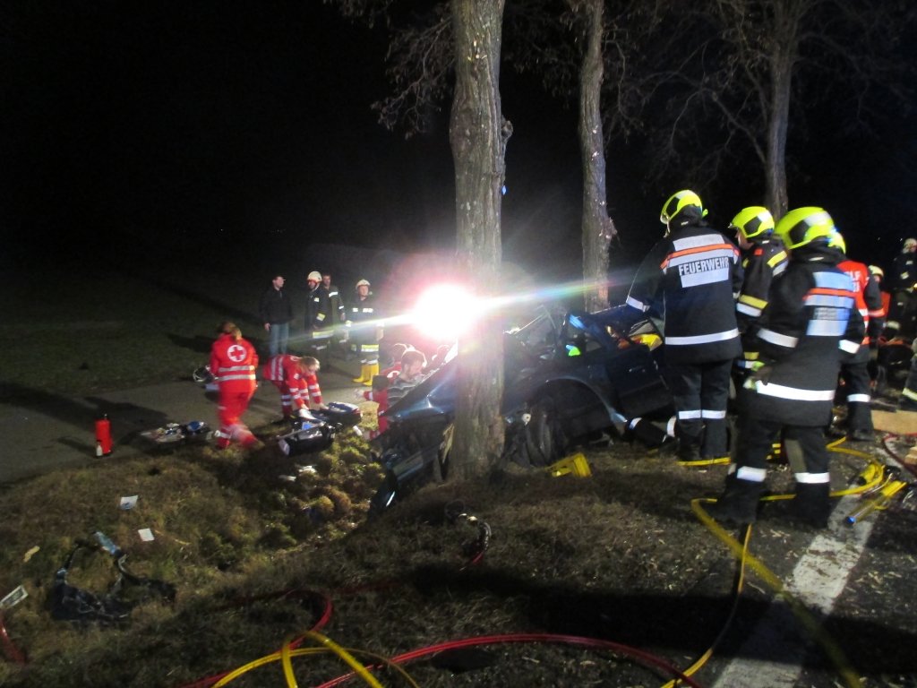 Ein Großaufgebot an Einsatzkräften wurde gegen 21:00 Uhr zu einem Verkehrsunfall mit eingeklemmter Person auf die Bundesstraße 4 zwischen Ravelsbach und Ziersdorf alarmiert. Ein PKW war von der Fahrbahn abgekommen und prallte gegen einen Baum – eine Person wurde im Fahrzeug eingeklemmt.