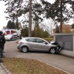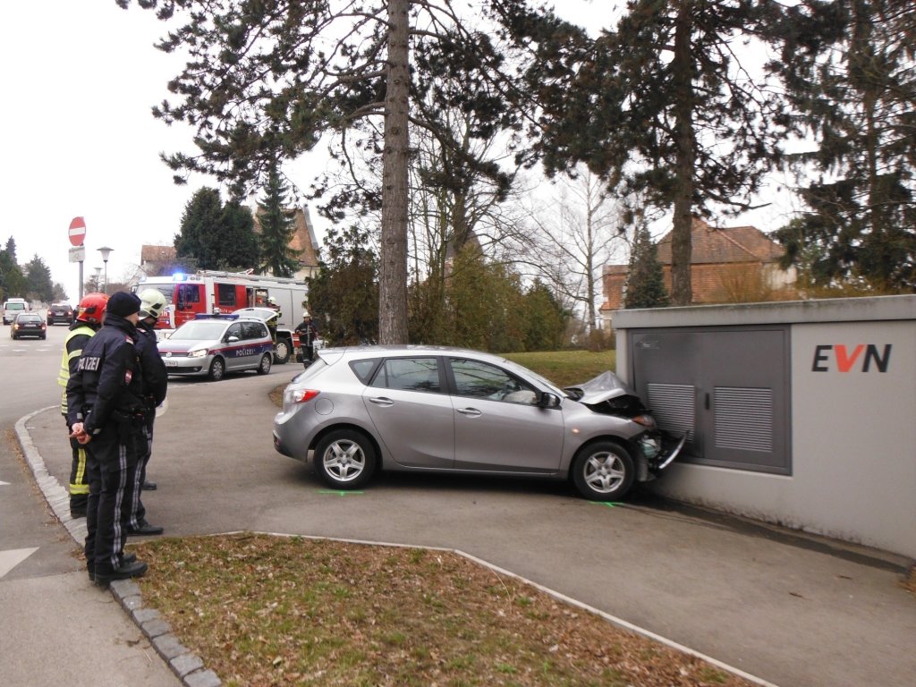 Nach dem Zusammenstoß krachte ein Lenker mit seinem PKW mit voller Wucht in einen Stromtransformator der EVN. Der Lenker wurde mit dem Rettungswagen des Roten Kreuz Hollabrunn mit Verletzungen unbestimmten Grades in das Landesklinikum Hollabrunn gebracht.