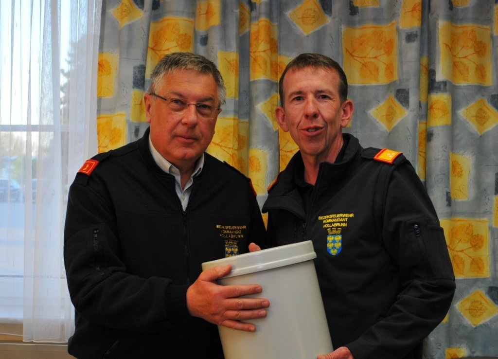 Bezirksfeuerwehrkommandant Alois Zaussinger erhielt am 22.04.2016 einen flammsicheren Papierkorb aus den Händen von Bezirkssachbearbeiter für Vorbeugenden Brandschutz FT Ing. Leo Kuhn.