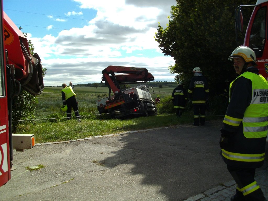Ein mit Grabsteinen beladener LKW war bei der Zufahrt zum Friedhof in Kleinhöflein abgerutscht und konnte sich aufgrund des aufgeweichten Bodens nicht aus eigener Kraft befreien. Ein ortsansässiger Landwirt sicherte mit seinem Traktor bis zum Eintreffen der Feuerwehr das Fahrzeug vor weiterem Abrutschen.
