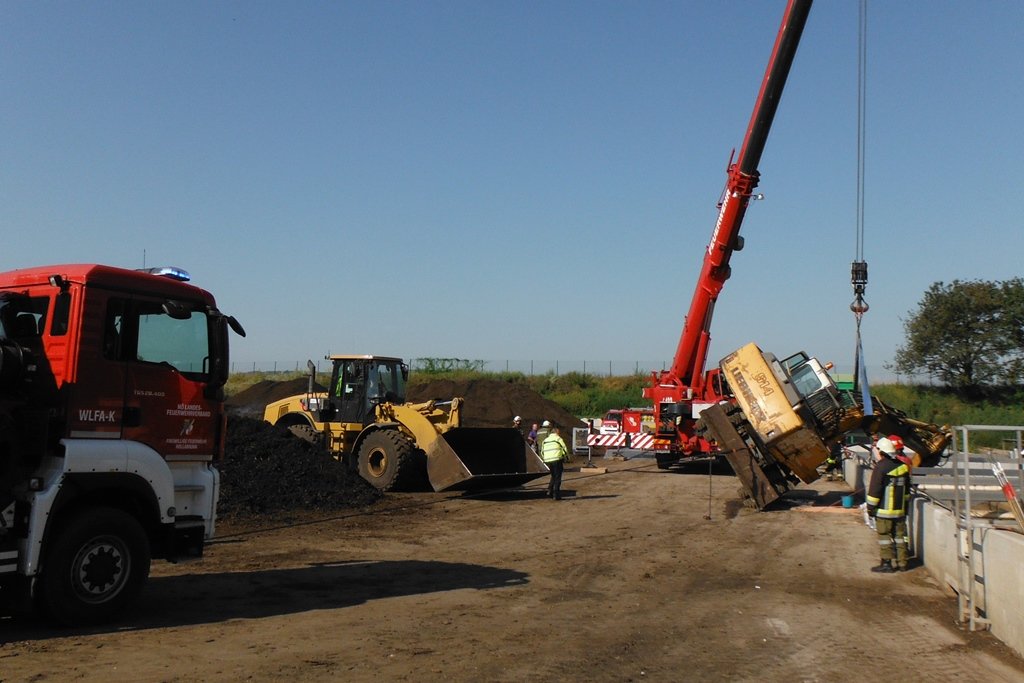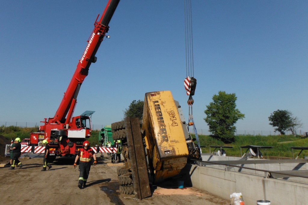 Durch ein technisches Gebrechen stürzte ein Bagger samt Lenker um und kam in weiterer Folge seitlich auf der Brüstung eines Sickerwasserspeicherbeckens zum liegen. Der Arm des Baggers versank dabei im Speicherbecken.