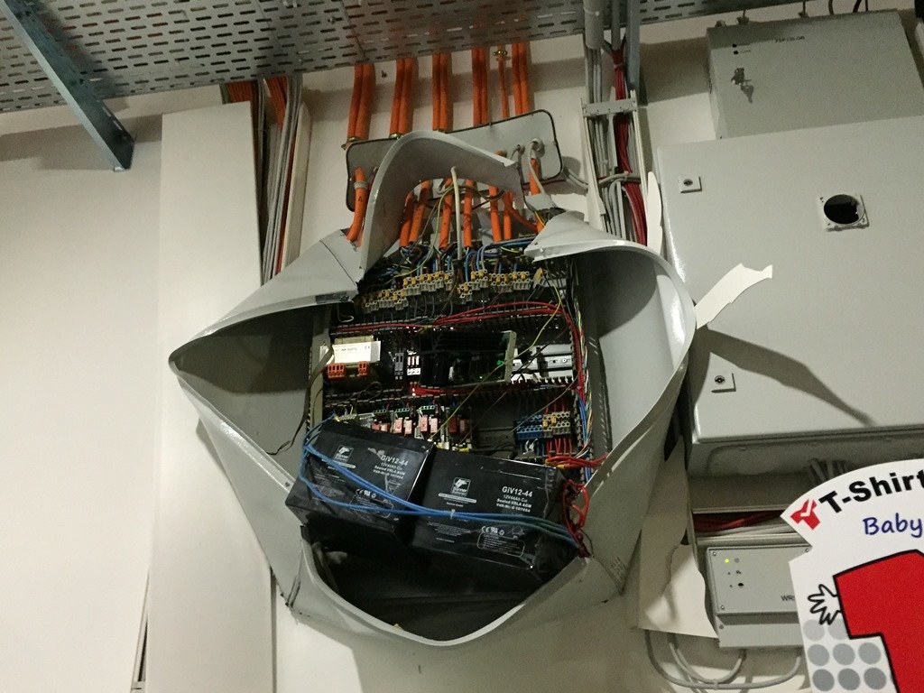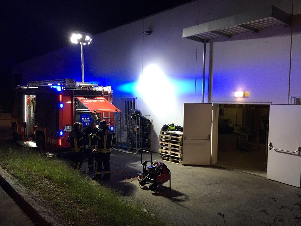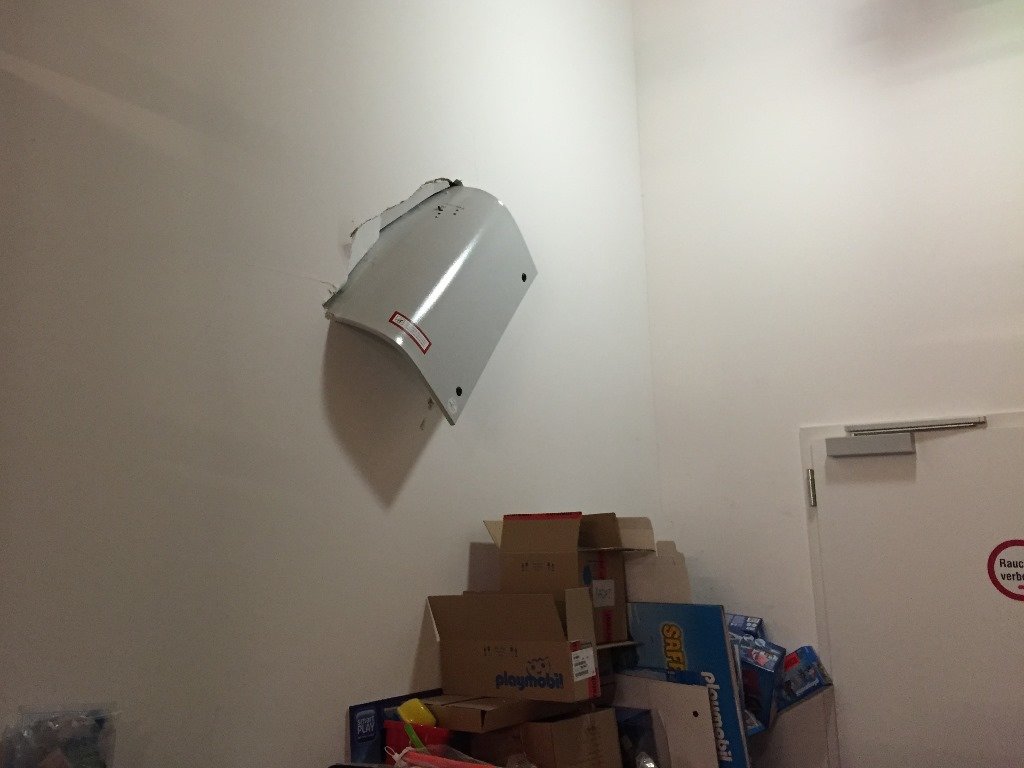 Bei der Erkundung durch den Einsatzleiter ABI Christian HOLZER konnte in einem Lagerraum ein beißender Geruch wahrgenommen werden. Unverzüglich rüstete sich der Atemschutztrupp des Hilfeleistungsfahrzeuges aus um die genauere Lage zu erkunden. In weiterer Folge wurde ein stark beschädigter Steuerungskasten für die Rauch- und Wärmeabzugsanlage vorgefunden in dem zwei Batterien installiert waren. Durch eine Knallgasexplosion wurde der Steuerungskasten stark beschädigt. Die Abdeckung des Steuerungskasten steckte etwa 10 Meter weit entfernt in einer Mauerwand fest.