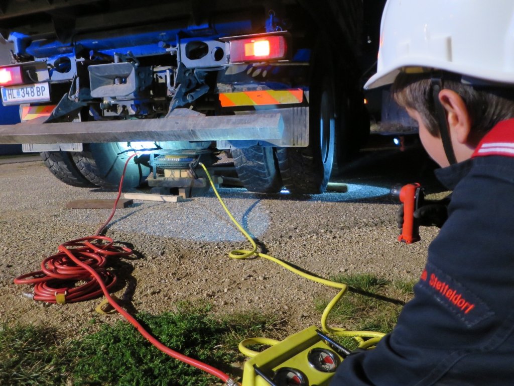 Sofort machten sie sich auf dem Weg zum Einsatzort. Bei der Erkundung des Einsatzleiters JFM Stefan EDER stellte sich heraus, dass ein LKW Fahrer eine Person erfasst hat und diese unter dem schweren Fahrzeug eingeklemmt war. Nach kurzer Beratschlagung der Jugendgruppe entschied man sich für den Einsatz der Hebekissen. Unverzüglich wurden die entsprechenden Geräte vorbereitet.