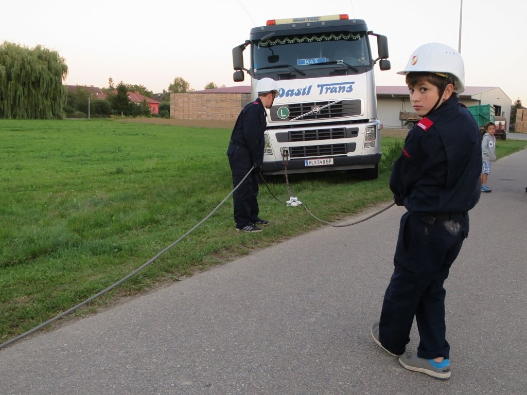 Als nächstes befassten sich die Betreuer und Jugendlichen mit der Seilwinde des Rüstlöschfahrzeuges. Dabei wurde der Jugendgruppe die Aufgabe gestellt, den LKW aus einer Grünfläche auf die Fahrbahn zurück zu ziehen. Nach dem Einbau einer Umlenkrolle und der Verwendung der richtigen Anschlagmittel schaffte man es schließlich das schwere Gerät auf die Fahrbahn zurück zu ziehen. Nach einer kurzen Stärkung im Feuerwehrhaus wurde die Feuerwehrjugendgruppe per Funk zu einem Einsatz alarmiert. Verkehrsunfall, Person unter LKW lautete das Alarmstichwort für die Jugendfeuerwehrmänner aus Kleinstetteldorf.