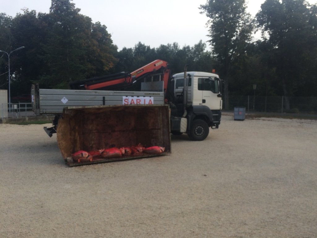 Die Umladung der Tierteile in bereitgestellte Behälter erfolgte laut Anweisung des Einatzleiters unter vornahme von Schutzausrüstung der Schutzstufe 2. Zeitgleich wurde durch eine weitere Gruppe ein professioneller Dekontaminationsplatz errichtet und die eingesetzten Kräfte nach dem Einsatz dekontaminieren zu können.