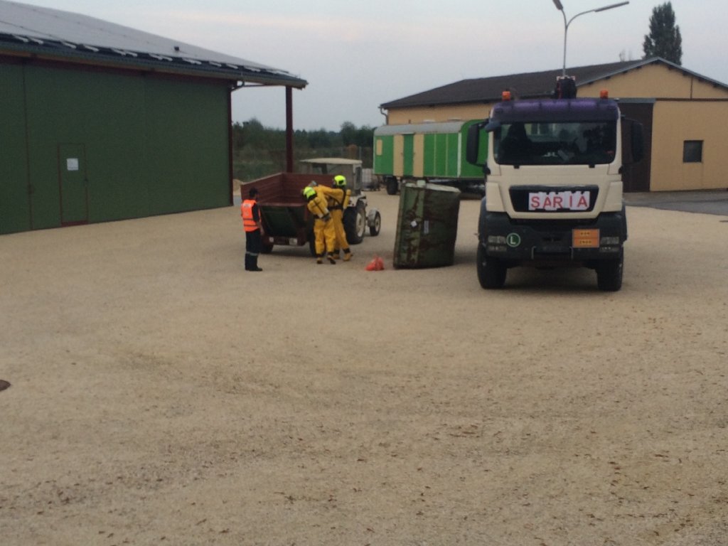 Annahme der Übung war, dass ein LKW, eine Mulde mit Tierkadavern in einer Kurve verloren hatte. In der Mulde befanden sich teilweise feste und flüssige Reste von Schweinen. Um 17:30 rückte die örtlich zuständige Feuerwehr zu Übung aus. 10 Minuten verzögert kamen die einzeln Schadstoffgruppen dazu um einen realistischen Ablauf zu gewährleisten.