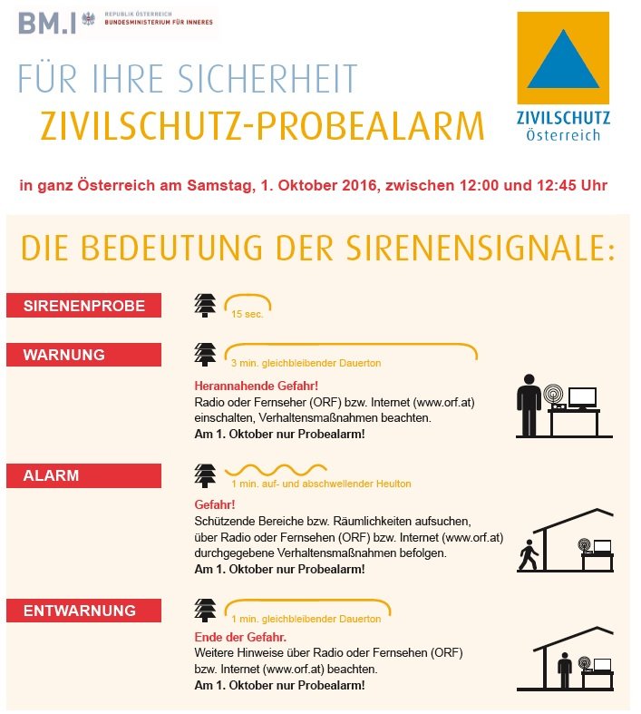 Am Samstag, 1. Oktober 2016, wird wieder der österreichweite Zivilschutz-Probealarm vom Bundesministerium für Inneres (BM.I) durchgeführt. Der Probealarm soll Sie mit den Zivilschutz-Signalen vertraut machen und gleichzeitig die Funktion und Reichweite der über 8.000 Sirenen testen.