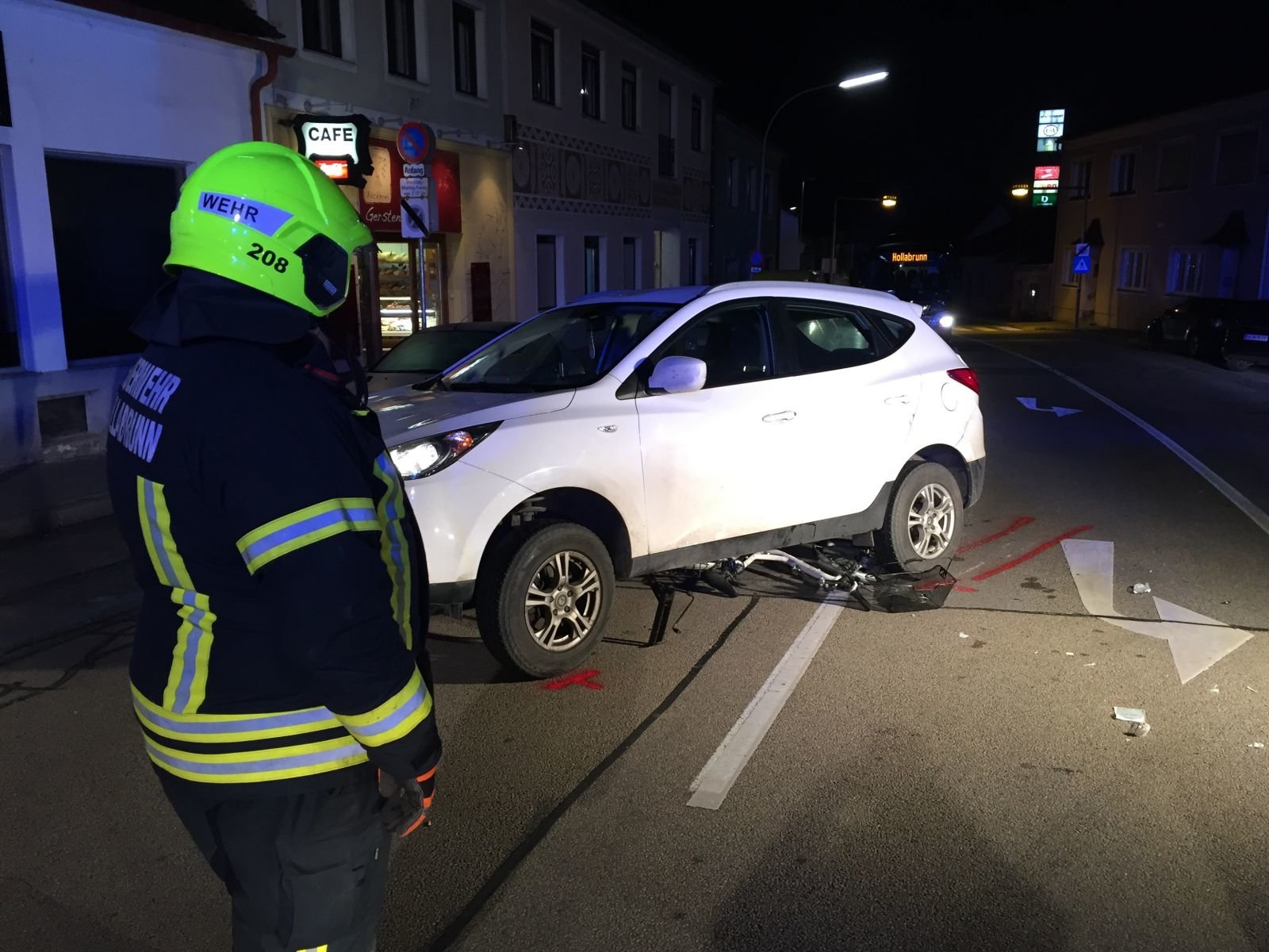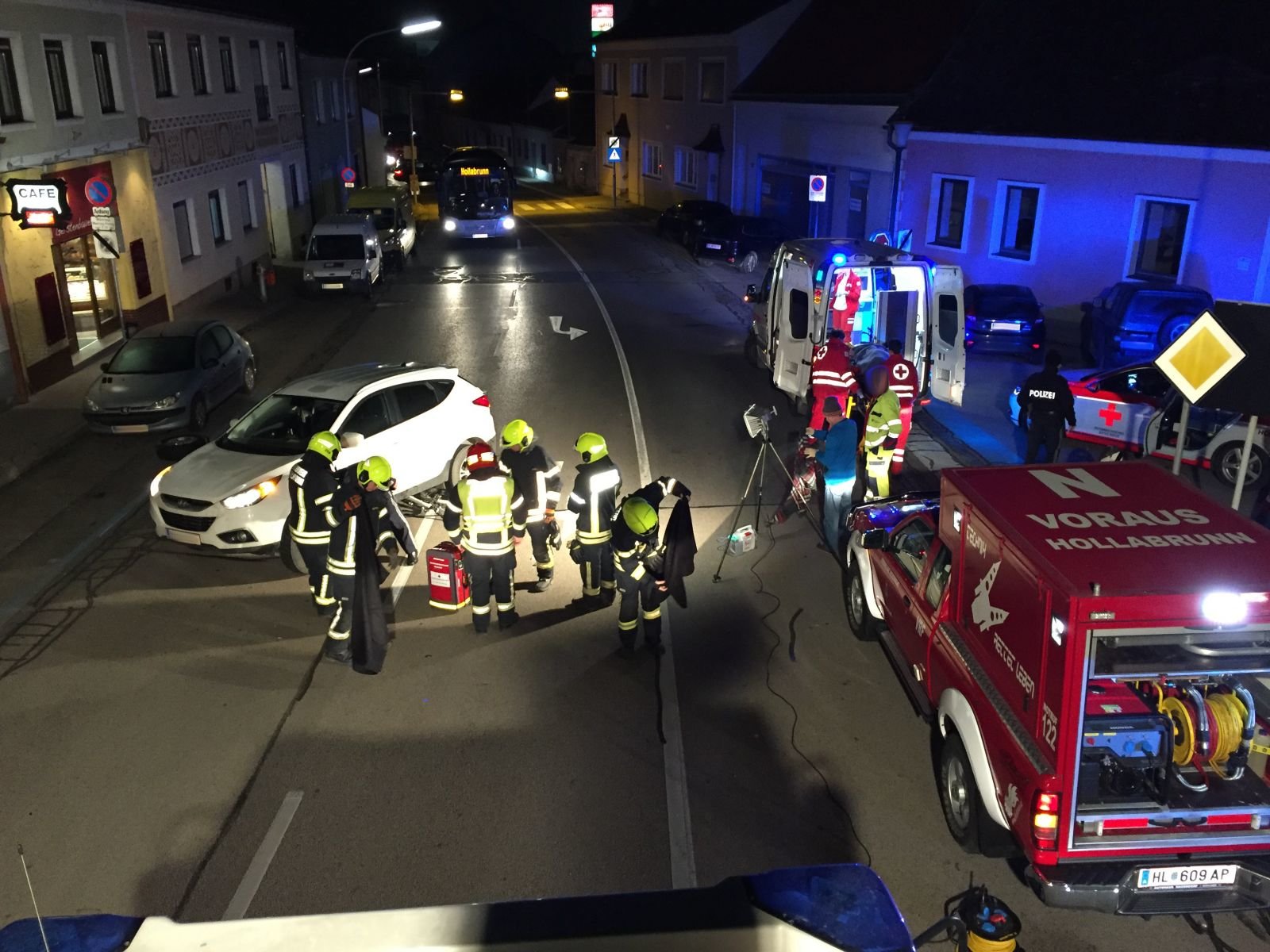 In weiterer Folge wurde von den Mitgliedern der Feuerwehr Hollabrunn die Unfallstelle für die Sanitäter des Roten Kreuz Hollabrunn ausgeleuchtet.