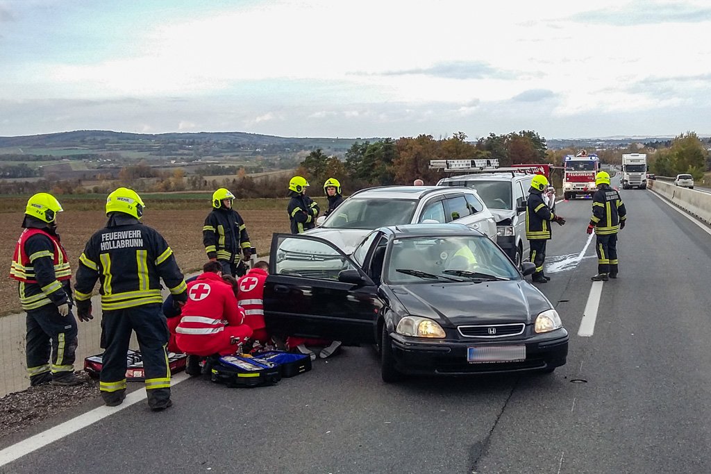Nach einem Auffahrunfall auf der Schnellstraße 3, Hollabrunn Richtung Stockerau wurde die Feuerwehr Hollabrunn um 15:04 Uhr von der Landeswarnzentrale zu einer Autobahn-Bergung alarmiert. Bei der Erkundung durch die Besatzung des Vorausrüstfahrzeuges ergab sich folgendes Bild: Drei beteiligte beschädigte Fahrzeuge, zwei verletzte Personen, eine davon bewusstlos im Fahrzeug. Als Erstmaßnahme wurde die Unfallstelle abgesichert, ein Brandschutz aufgebaut und den verletzten Personen Erste Hilfe geleistet.