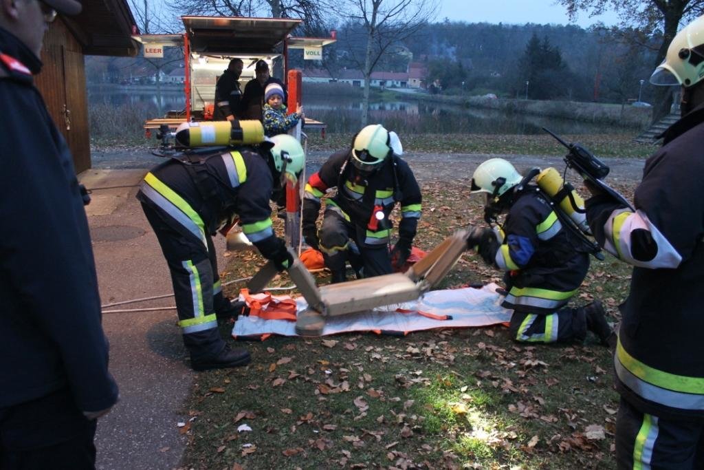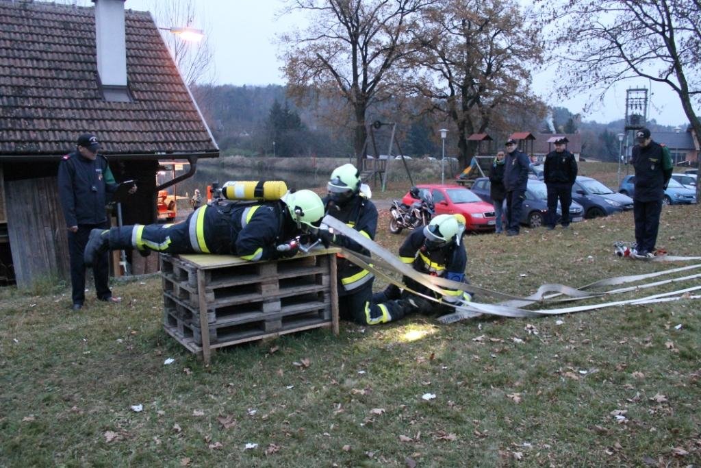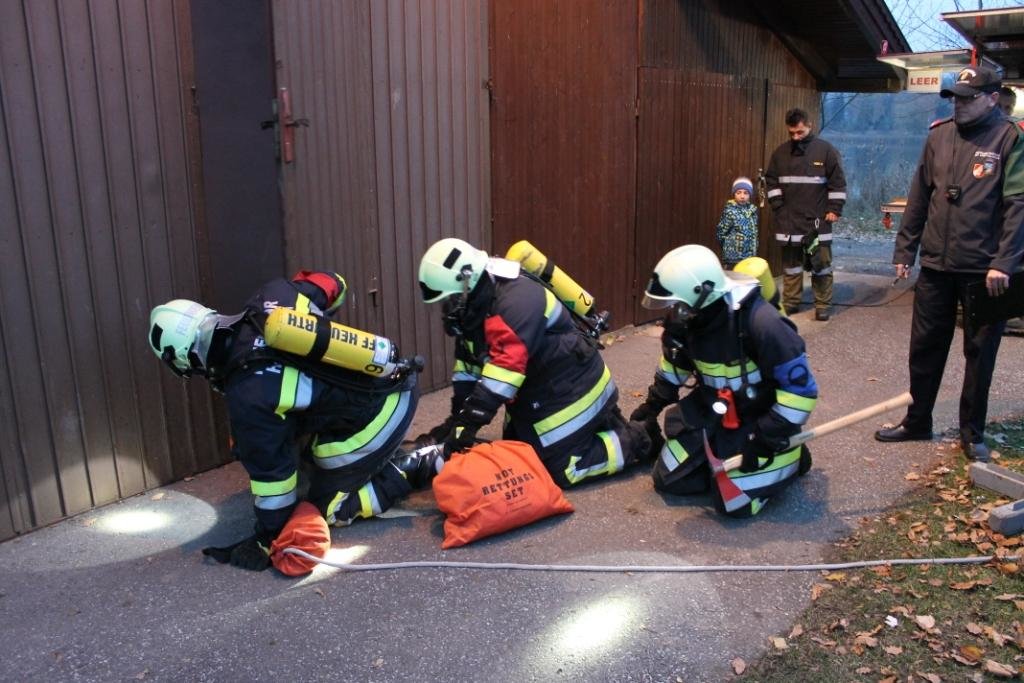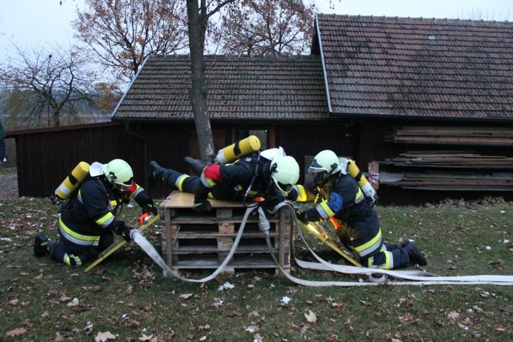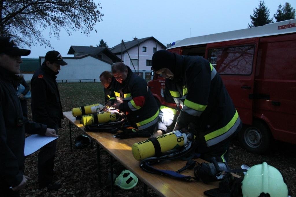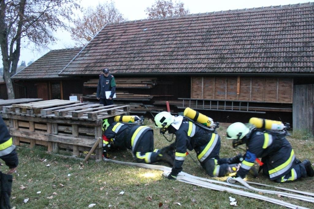 Bei den Stationen geht es um das korrekte Ausrüsten mit Atemschutzgeräten, Personensuche in einem verrauchten Raum, Löschangriff mit Hindernissen und zum Abschluss müssen die Geräte wieder ordnungsgemäß im Fahrzeug verladen werden. Der Gruppenkommandant muss sich auch einigen Fragen stellen.