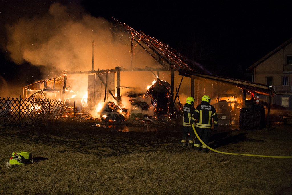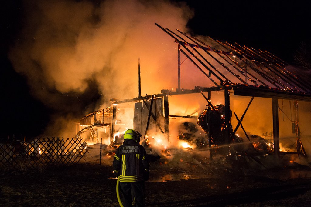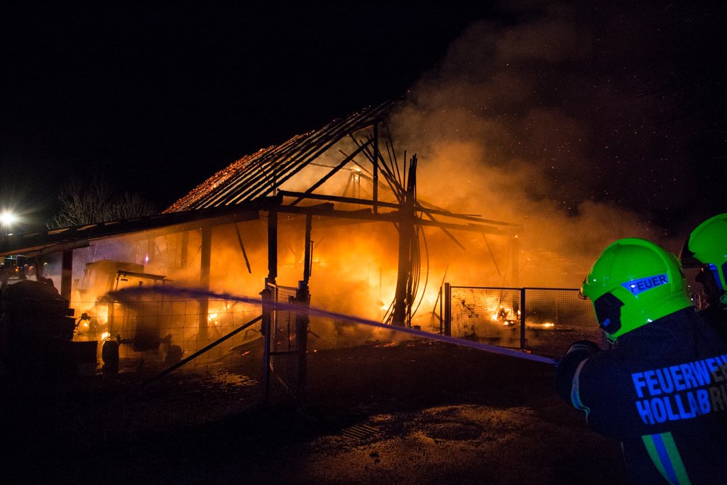 Kurz vor 02:00 Uhr morgens am 01.03.2017 entdeckte ein zufällig vorbeifahrender Autofahrer, eine in Vollbrand stehende Scheune in Wolfsbrunn bei Hollabrunn. Über den Notruf 122 wurden umgehend 8 Feuerwehren und über 50 Feuerwehrmitgliedern zum Einsatzort geschickt.