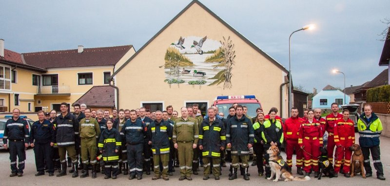 15 Hundeführer mit Hunden sowie 10 Helfern der Rettungshunde NÖ, ÖRHB und ÖHU