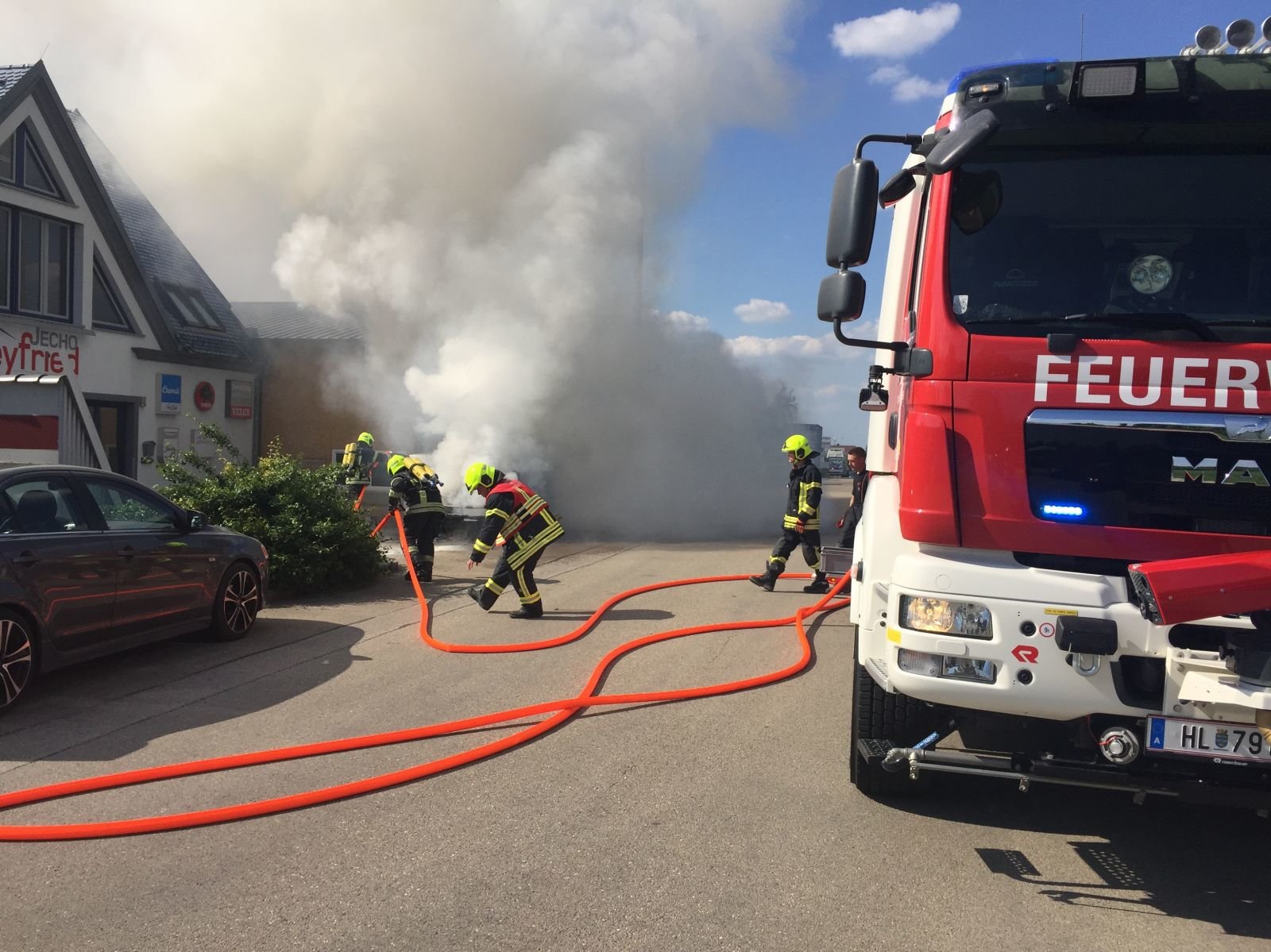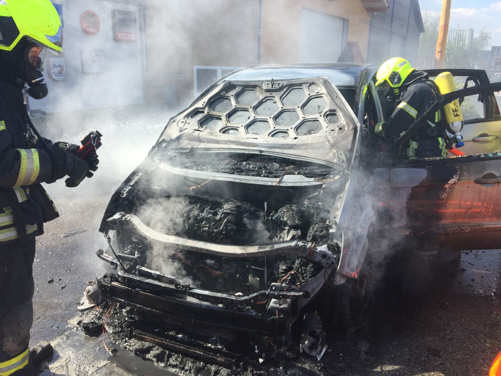 Beim Eintreffen der Einsatzkräfte stand der vordere Bereich des Fahrzeuges bereits in Vollbrand. Ein Atemschutztrupp des Hilfeleistungsfahrzeug 3 konnte unter Vornahme der C-Schnellangriffsleitung den Brand rasch unter Kontrolle bringen und ablöschen. Mit der Wärmebildkamera kontrollierte der eingesetzte Atemschutztrupp das Fahrzeug auf weitere Glutnester.