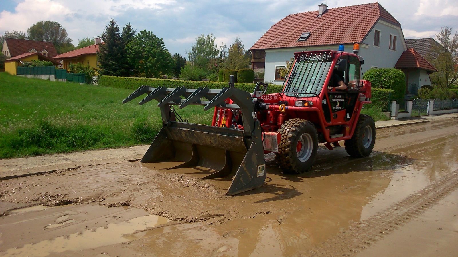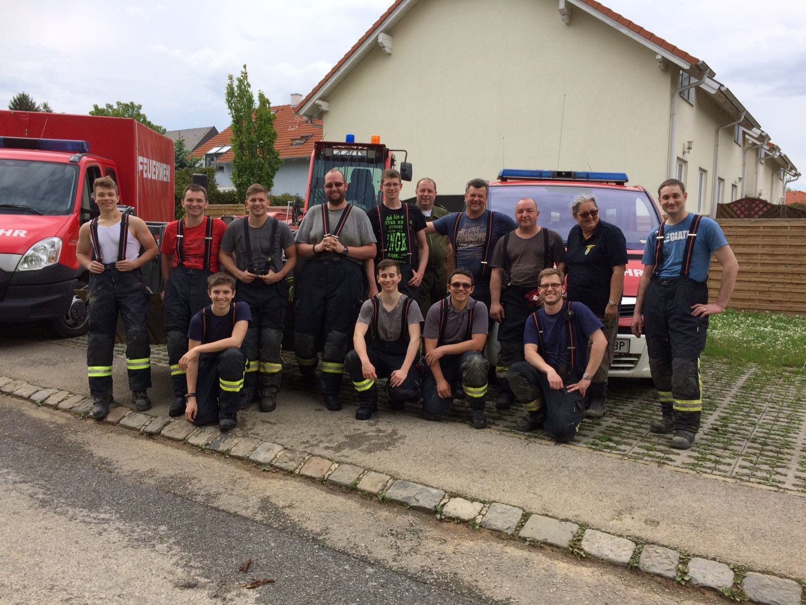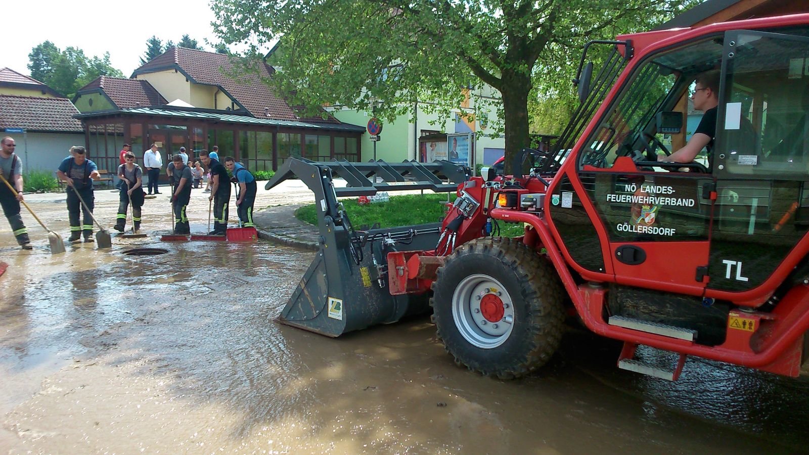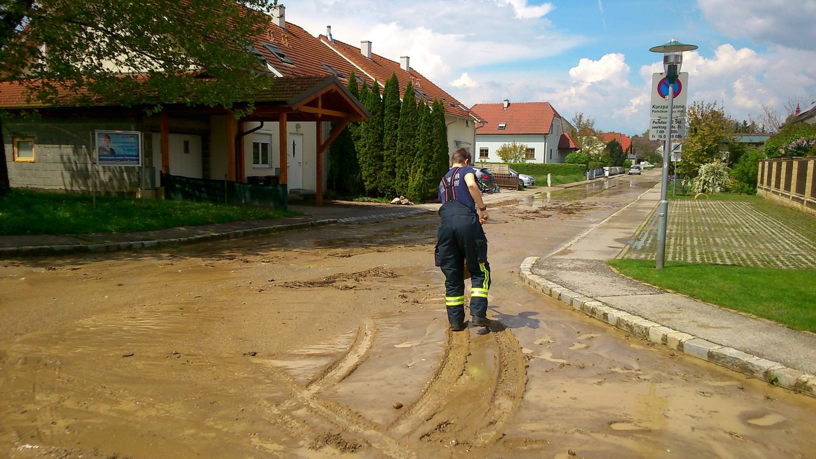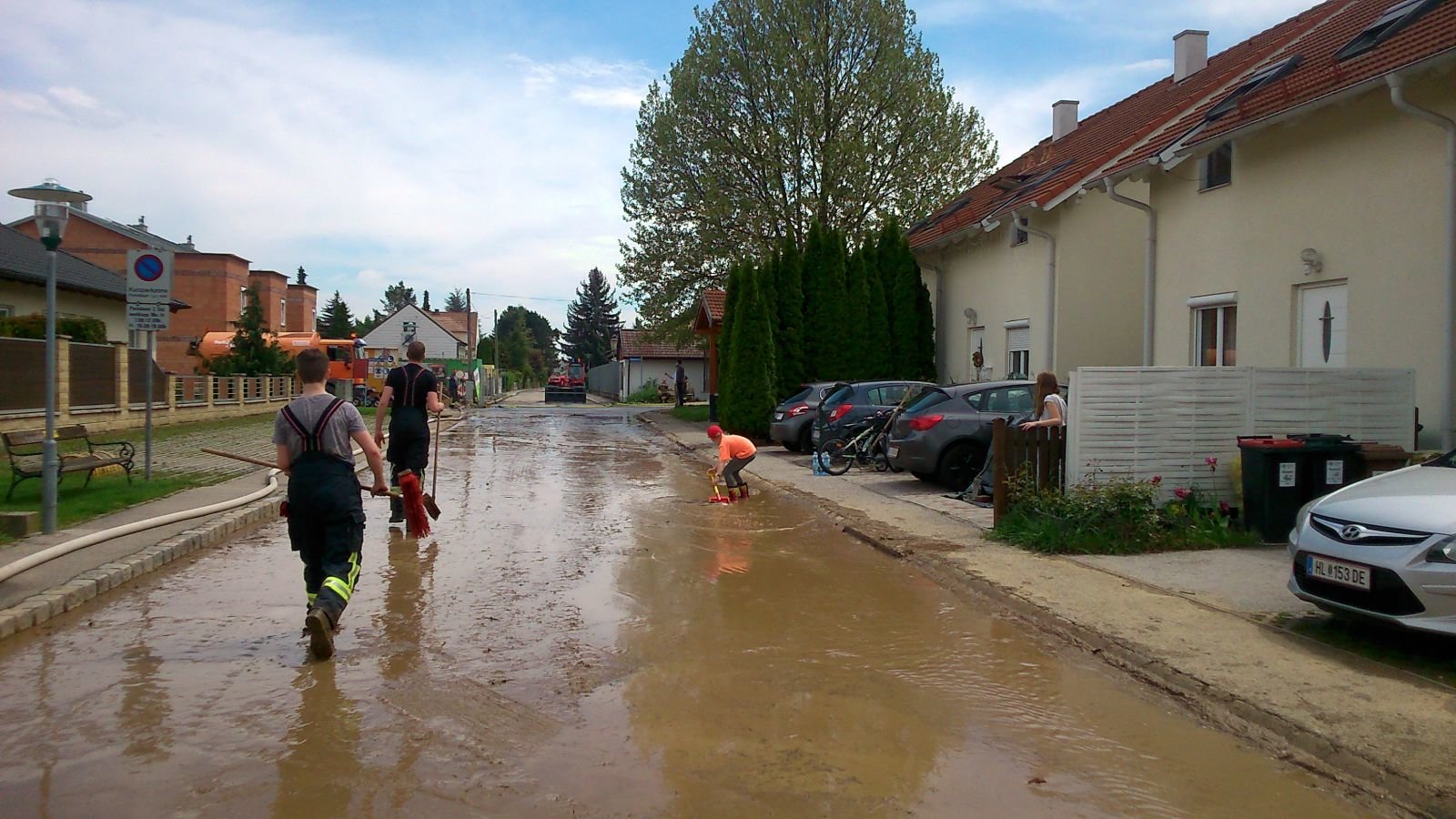 Kurz nach Mittag ging am 13.05.2017 über Göllersdorf ein kurzes aber starkes Unwetter nieder. Starkregen schwemmte von den Äckern Schlamm und Holzwerk in die Gerichtsbergasse und die Neugasse in Göllersdorf. Beide Straßen waren über mehrere Hundert Meter zentimeterhoch verschlammt. Der Keller des angrenzenden Kindergartens und die Häuser der Anwohner blieben glücklicherweise verschont. Mittels Muskelkraft, Besen, Schaufel und viel Wassers gelang es uns in mühevoller Arbeit die Straßen wieder befahrbar zu machen.