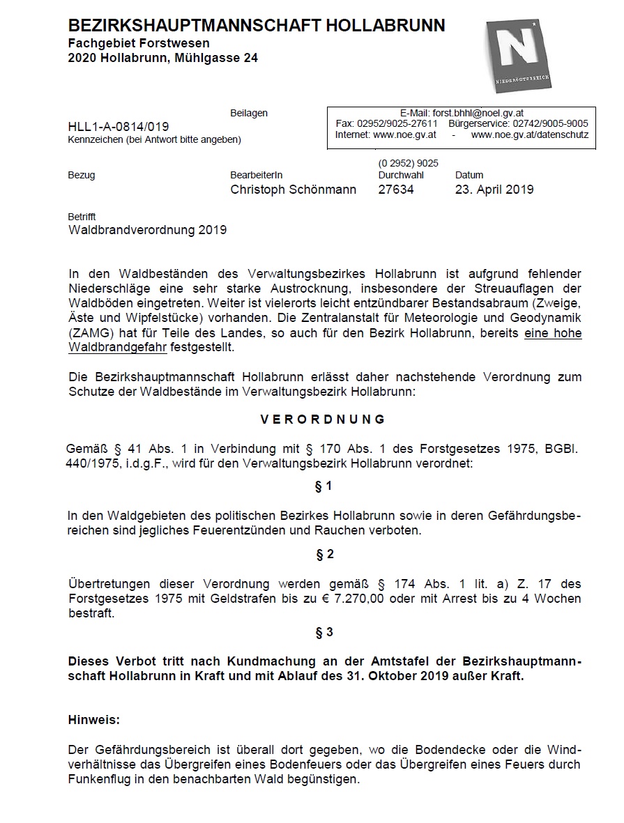 In den Waldgebieten des politischen Bezirkes Hollabrunn sowie in deren Gefährdungsbereichen sind jegliches Feuer entzünden und Rauchen verboten.
