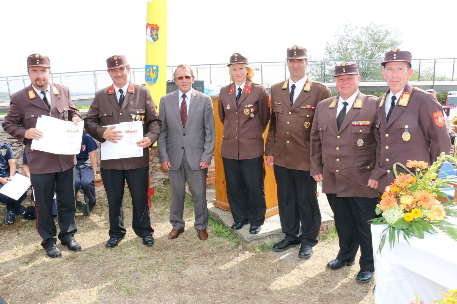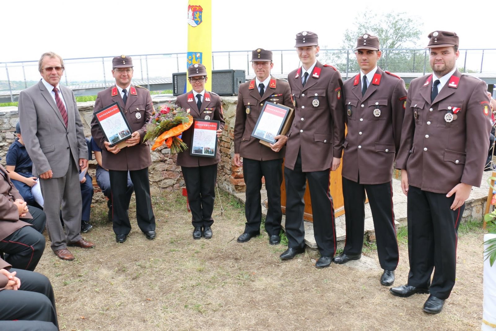 Bezirksfeuerwehrkommandant Alois Zaussinger hob hervor, dass bei der Feuerwehrjugend neben der Ausbildung auch der Spaß nicht zu kurz kommen soll. Gemeinsam mit seinem Stellvertreter BR Reinhard Scheichenberger, Abschnittsfeuerwehrkommandant Ing. Christian Lehninger sowie Bezirkssachbearbeiterin Feuerwehrjugend Sandra Grafeneder gratulierte er zum Jubiläum und überreichte den Kommandanten Viktor Koska und Andreas Zeindler die Jubiläumsurkunden.
