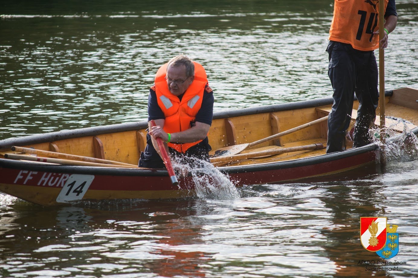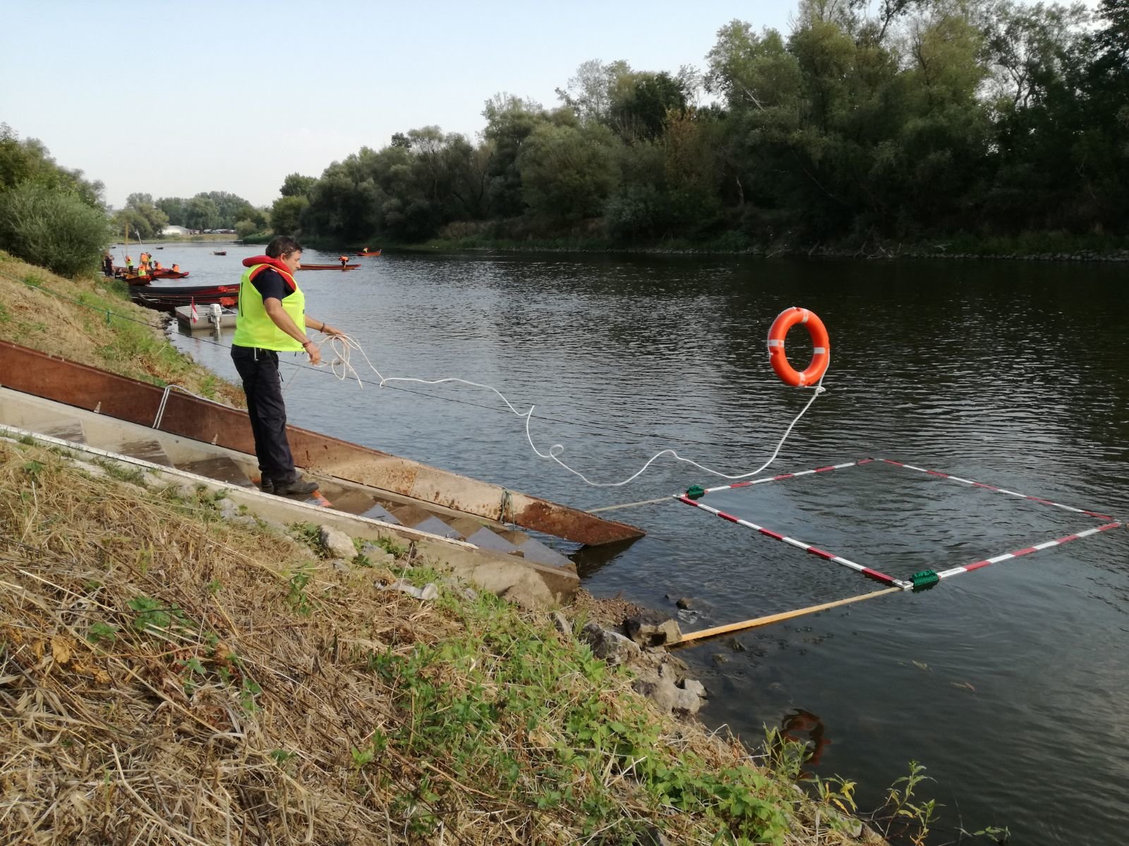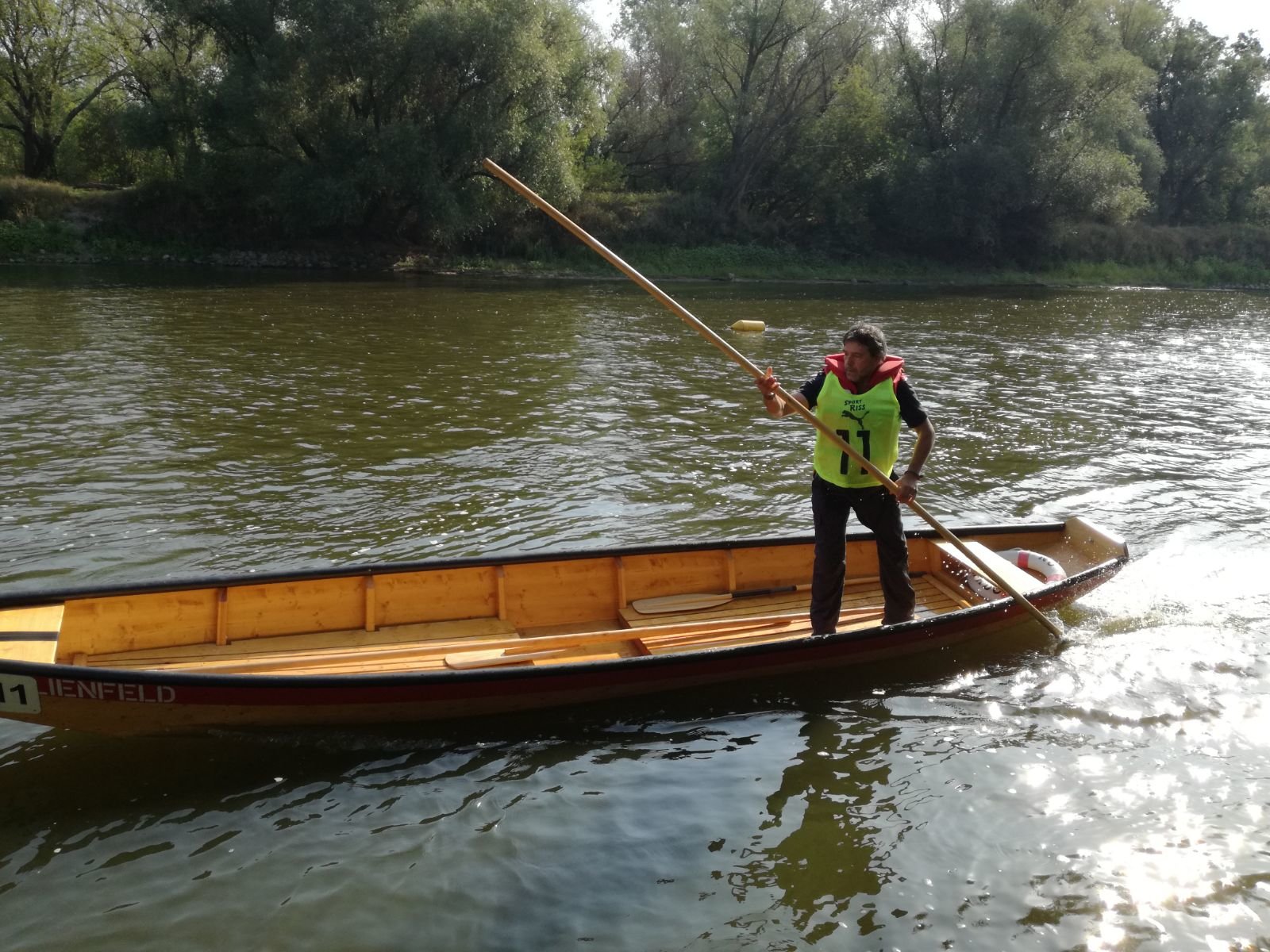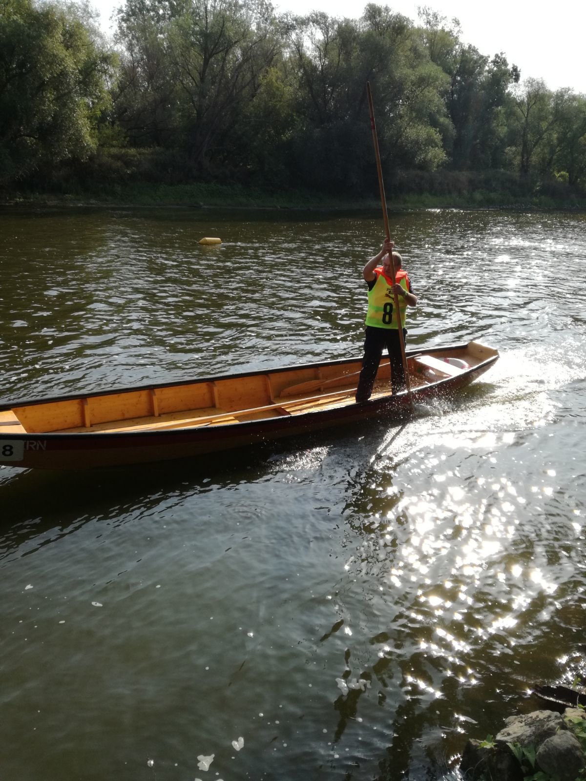 Die Zille ist mittels Schubstange einige hundert Meter stromaufwärts zu schieben. Dabei ist auch ein Schwimmholz, dass eine zu rettenden Person simuliert, richtig aufzunehmen.