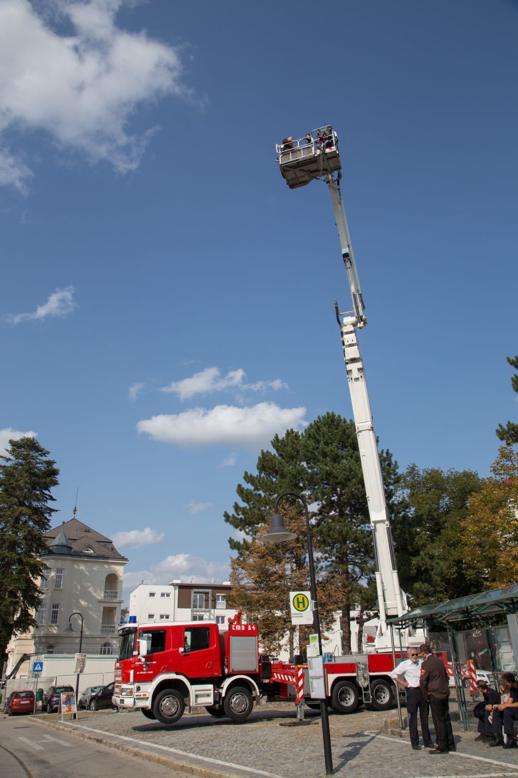 Danach mussten Birgit und Christian noch ein kleines Feuer löschen und den obligatorischen Baumstamm durchsägen. Später ging es mit dem Hubsteiger 54 Meter in die Luft.