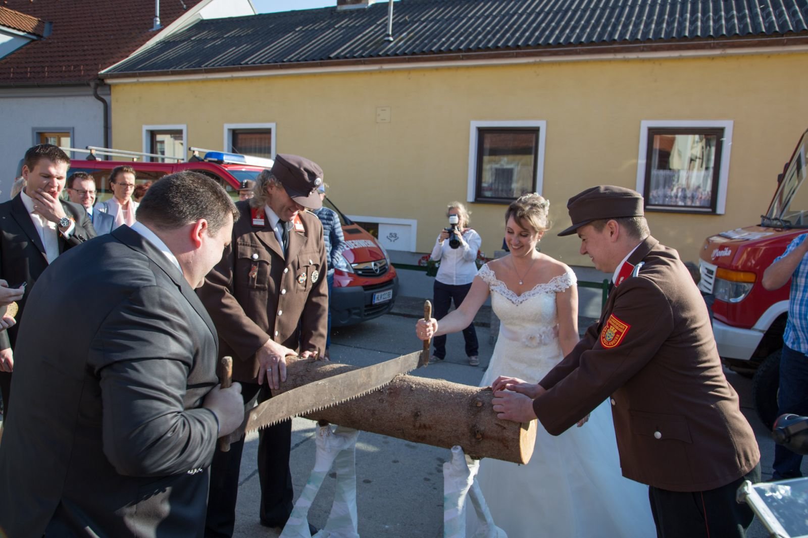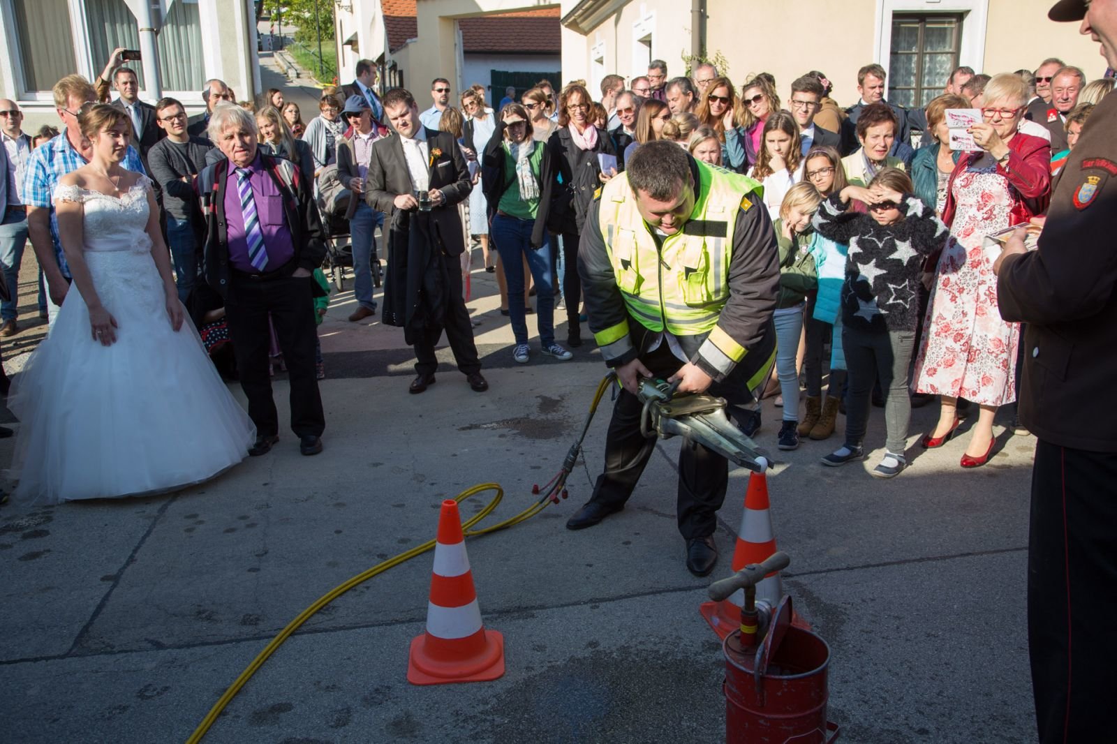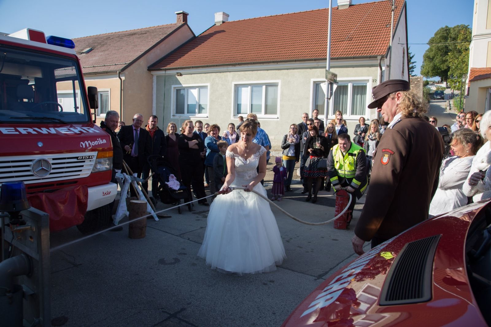 Nach der Trauung mussten Monika und Christian noch drei Aufgaben bewältigen. Die erste Aufgabe bestand im schieben einer Feuerwehrzille auf Rädern, danach mussten die beiden mit der Kübelspritze löschen und als Abschluss musste Christian ein rohes Ei mit dem hydraulischen Rettungssatz verlagern.