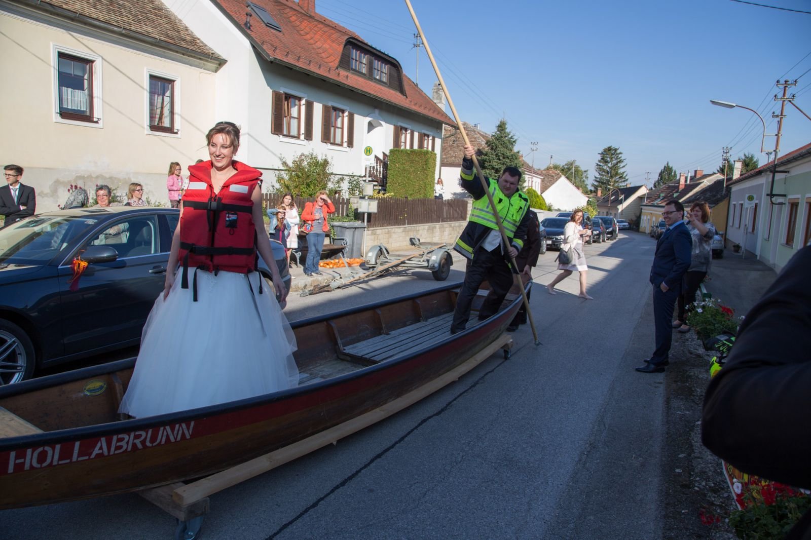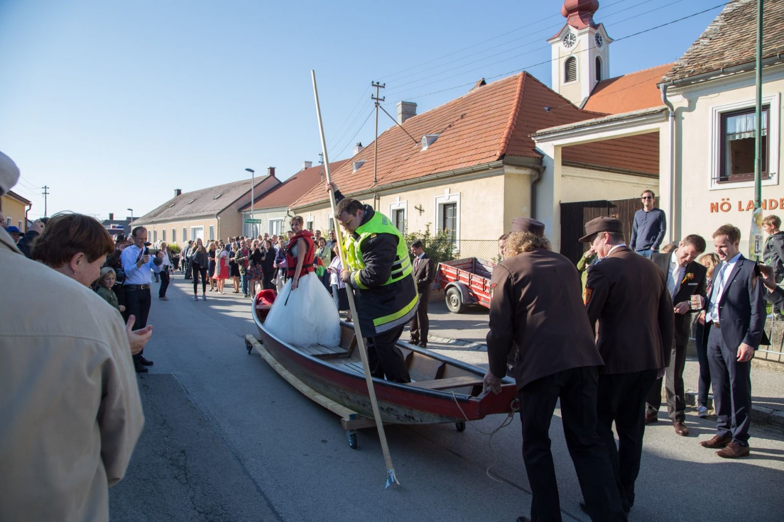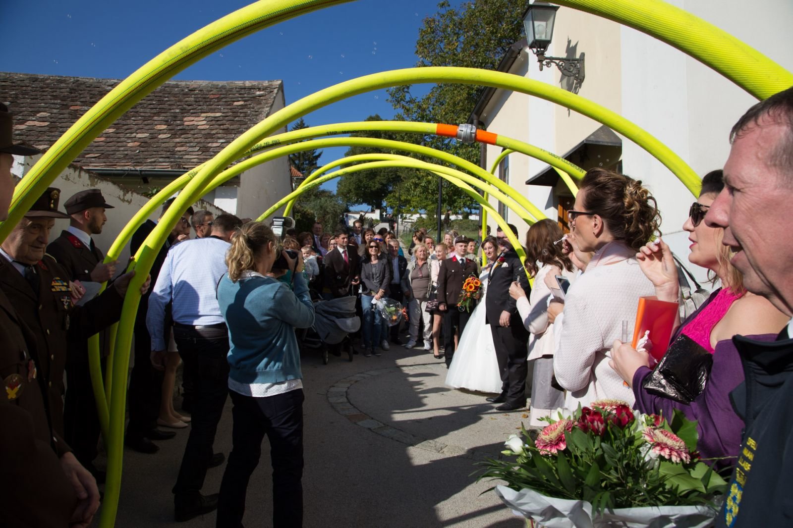 Nach der Trauung mussten Monika und Christian noch drei Aufgaben bewältigen. Die erste Aufgabe bestand im schieben einer Feuerwehrzille auf Rädern, danach mussten die beiden mit der Kübelspritze löschen und als Abschluss musste Christian ein rohes Ei mit dem hydraulischen Rettungssatz verlagern.
