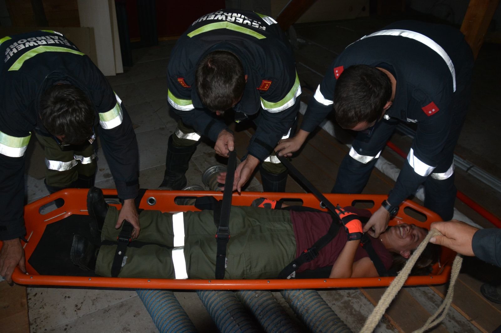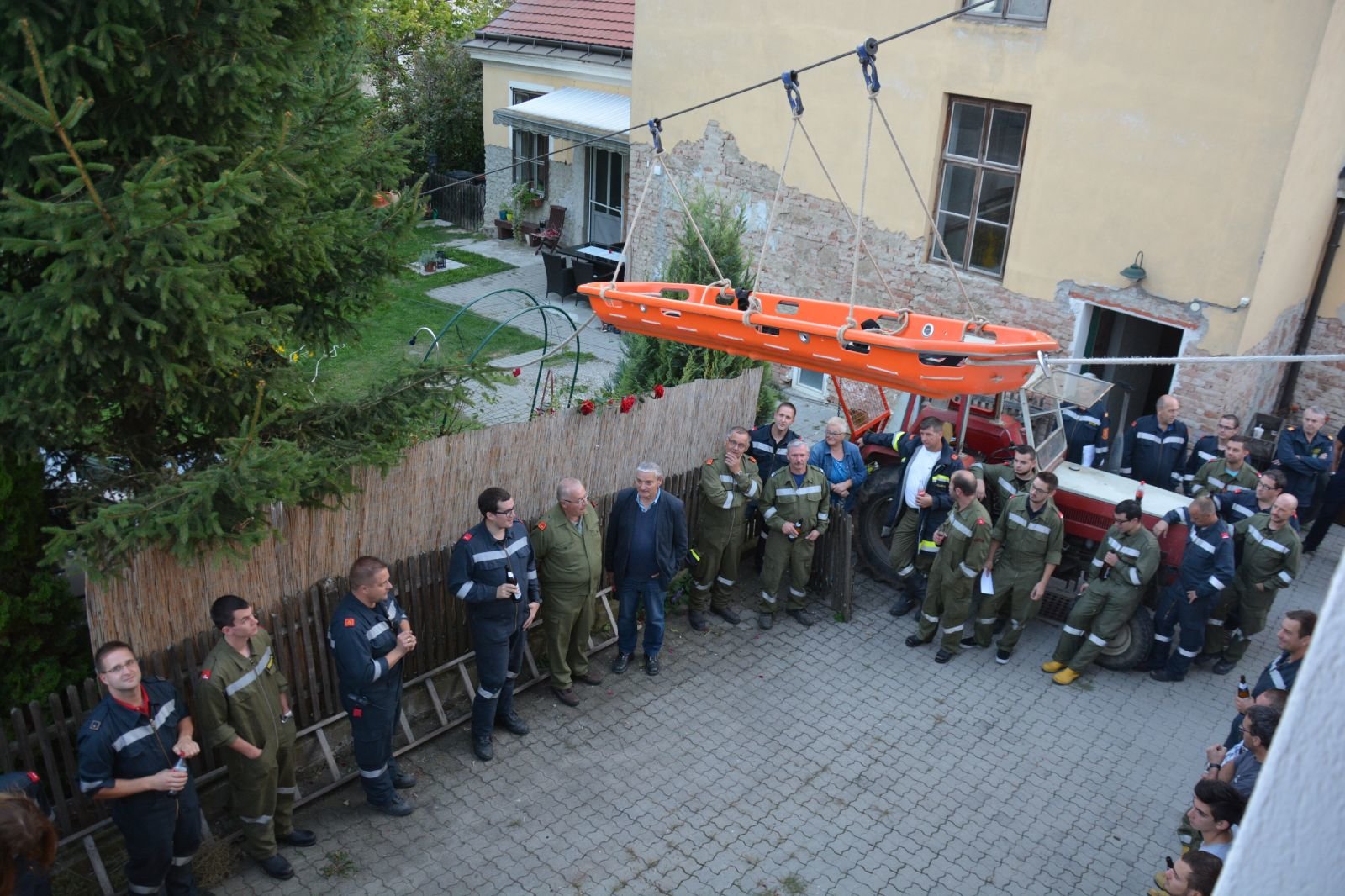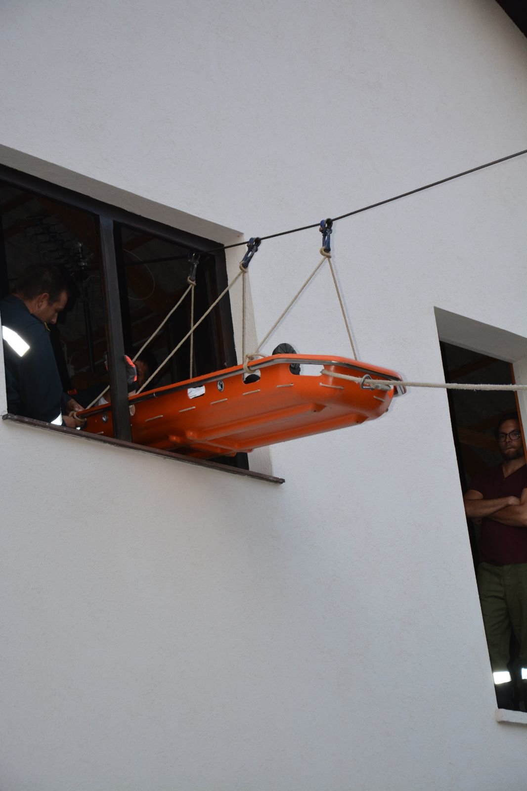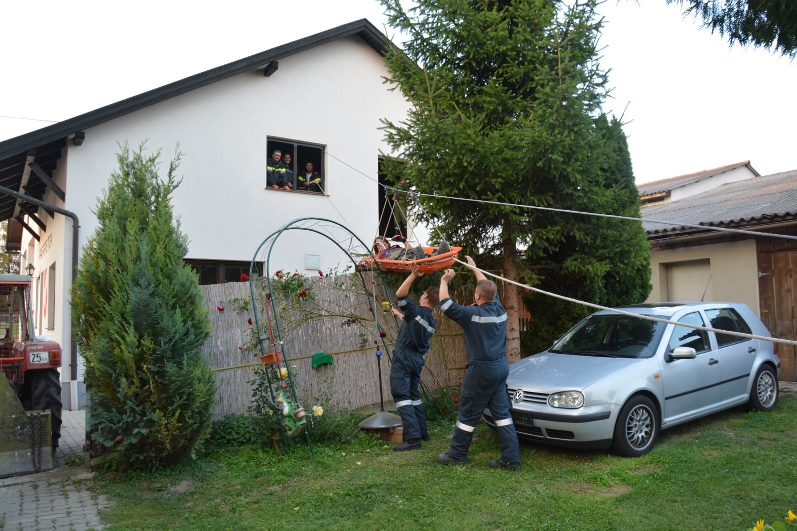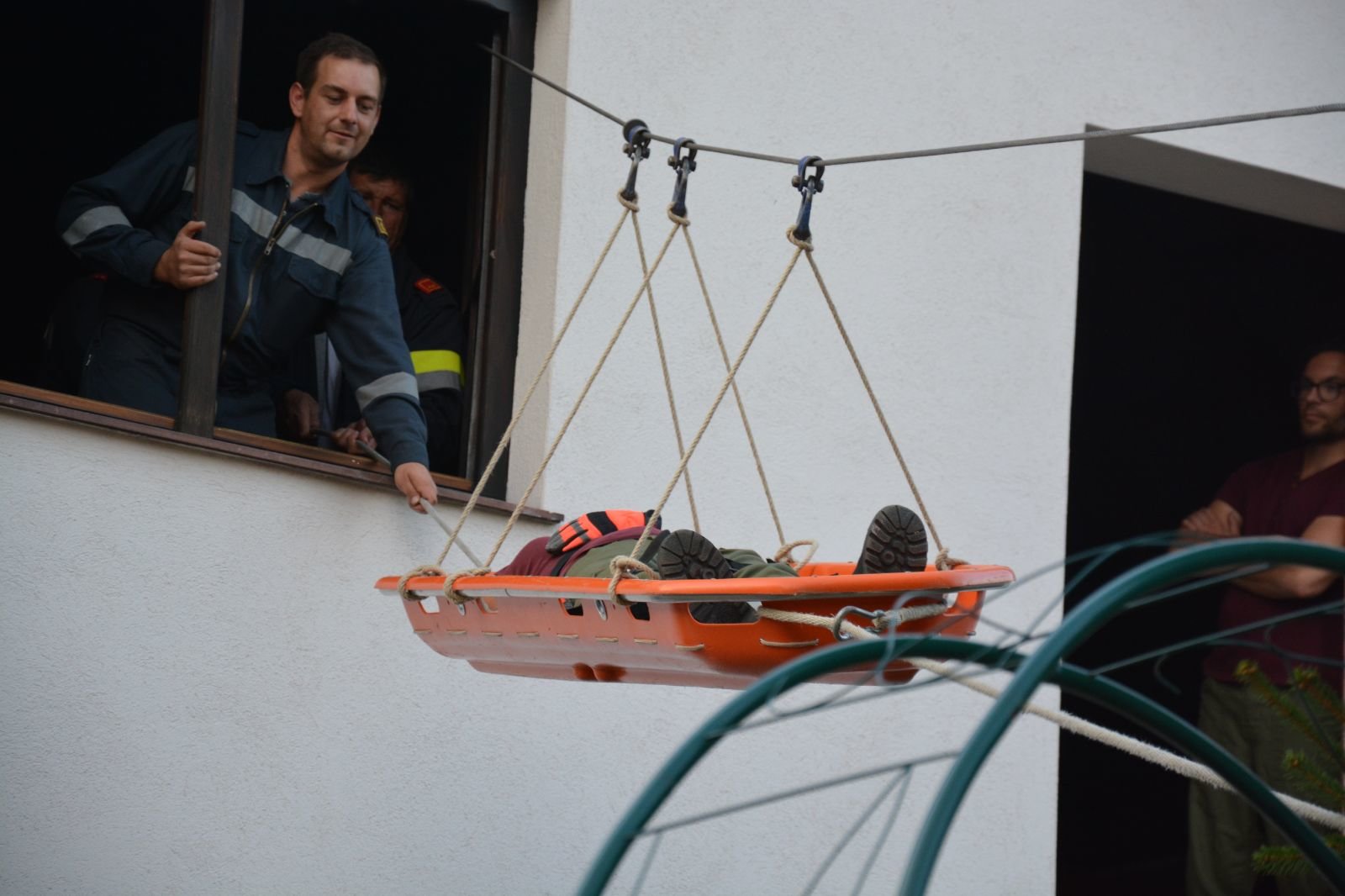5.) Schleifkorbtrage: verletzte Person aus dem ersten Stock mittels Seilbahn und Schleifkorbtrage abseilen –> FF Gaindorf