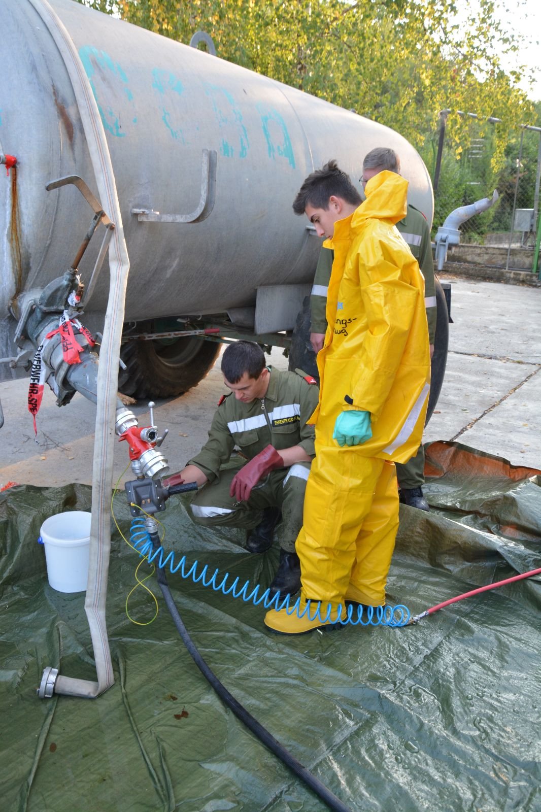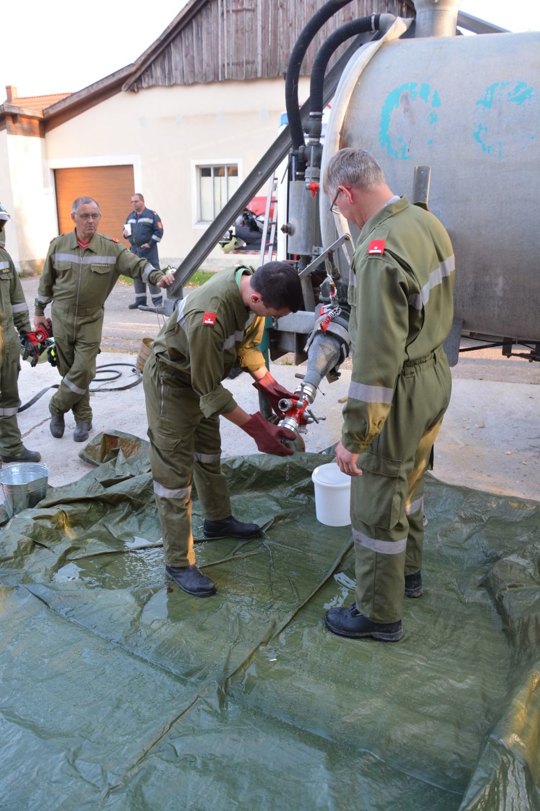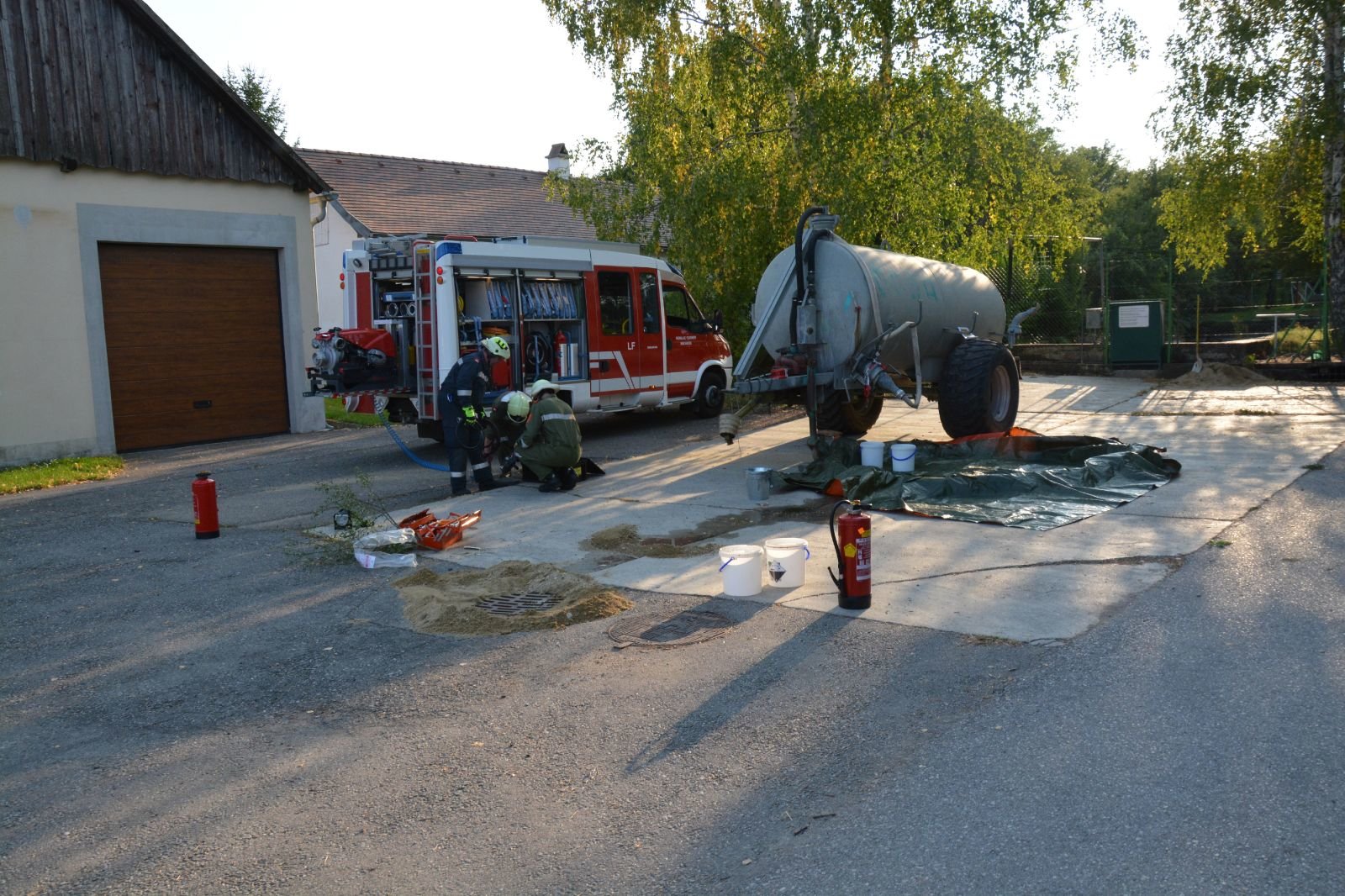 1.) Schadstoff: ein Tank ist undicht und muss abgedichtet werden bzw. eruiert werden, welche Flüssigkeit im Tank ist –> FF Minichhofen mit dem Schadstoffanhänger des Unterabschnittes