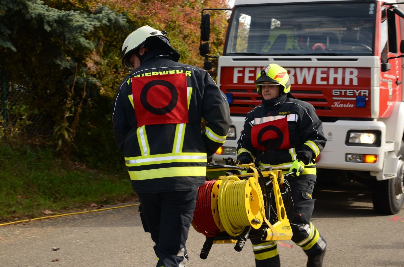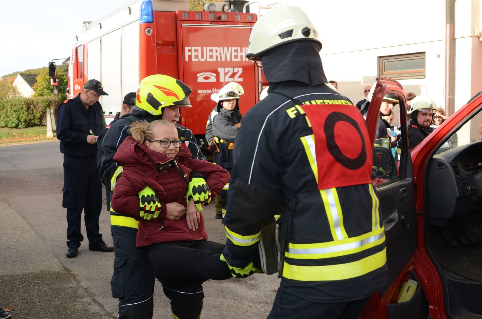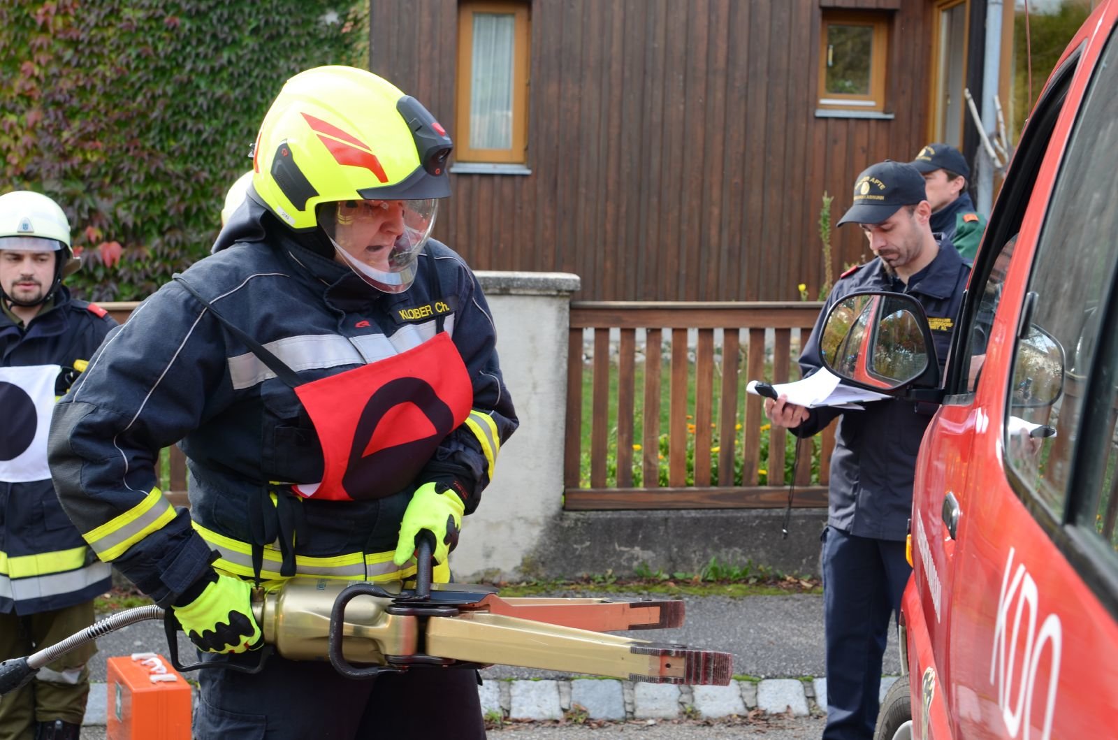Der nächste Punkt der Ausbildungsprüfung umfasst die Gerätekunde am Fahrzeug. Dabei muss jeder Teilnehmer 2 Karten mit einem Gerätebegriff, der in dem Einsatzfahrzeug verladen ist, ziehen und anschließend bei geschlossenen Rollläden 10cm genau auf dieses Gerät zeigen. Der letzte und schwierigste Teil der Prüfung ist der Ablauf eines Technischen Einsatzes. Dabei führt die komplette Mannschaft die Tätigkeiten aus, die bei einem Verkehrsunfall anfallen. Darunter fallen Absichern der Einsatzstelle, Aufbau der Beleuchtung und des Brandschutzes sowie die Befreiung einer Person aus dem KFZ mittels Spreizer und Schere.