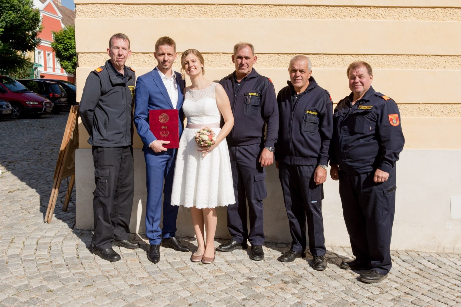 Die Feuerwehr Obritz und das Bezirksfeuerwehrkommando Hollabrunn gratulierten beim Retzer Standesamt.