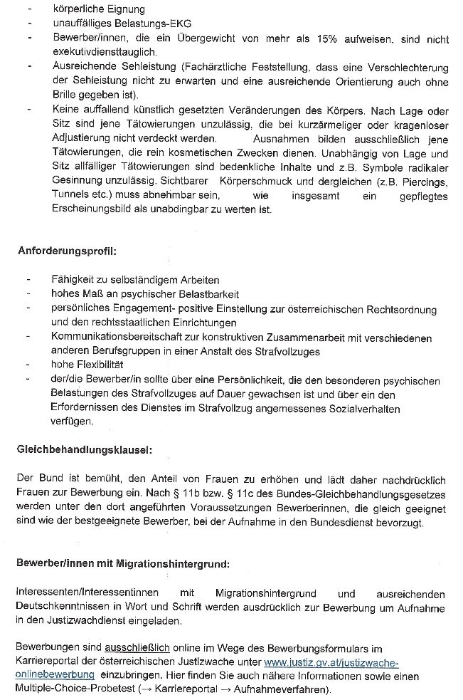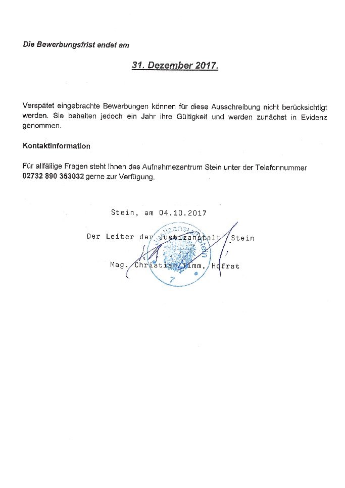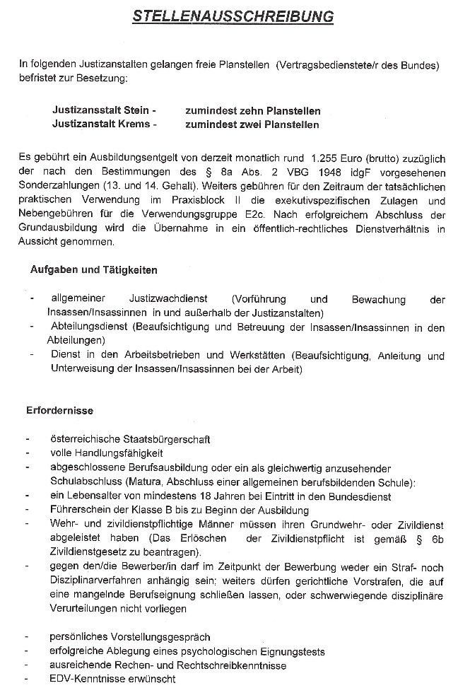 Auch die Justizanstalt Krems bzw. Stein hat uns gebeten eine Stellenausschreibung im Justizwachedienst zu veröffentlichen. Details ebenfalls anbei.