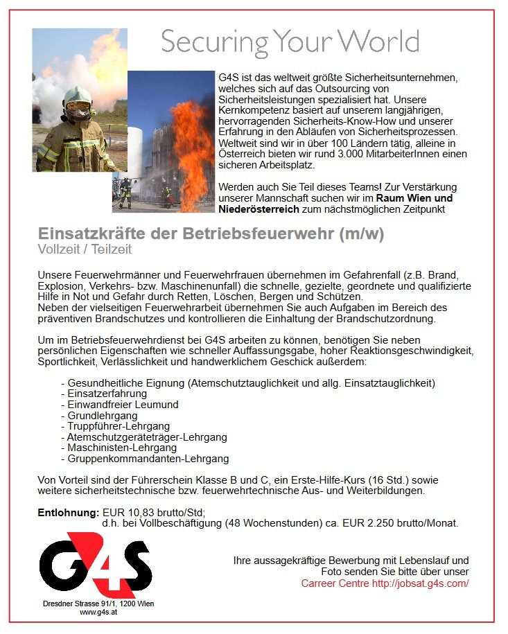 Auf Bitte der Firma G4S veröffentlichen wir eine Stelle als Einsatzkraft in einer Betriebsfeuerwehr. Details anbei.