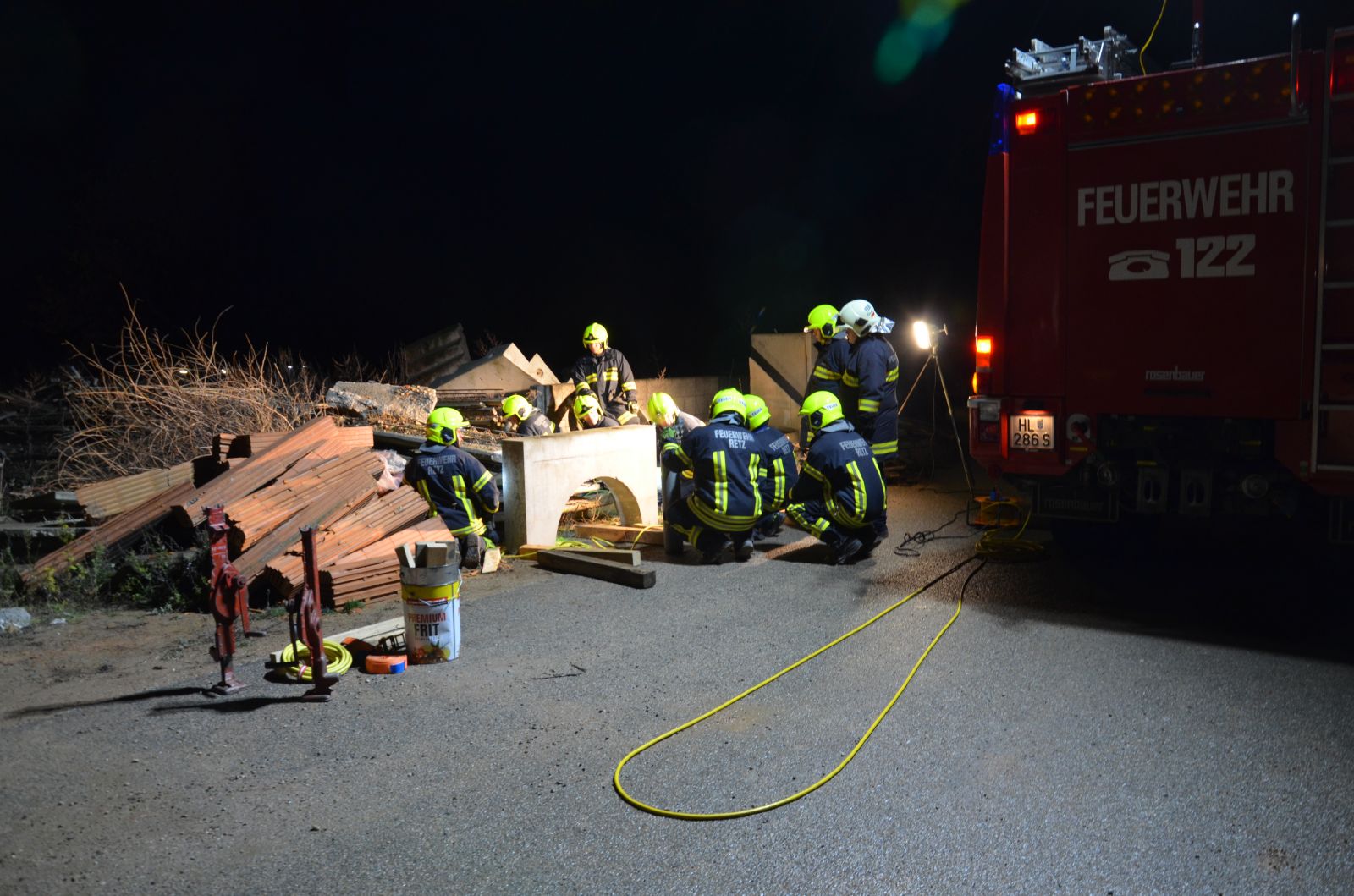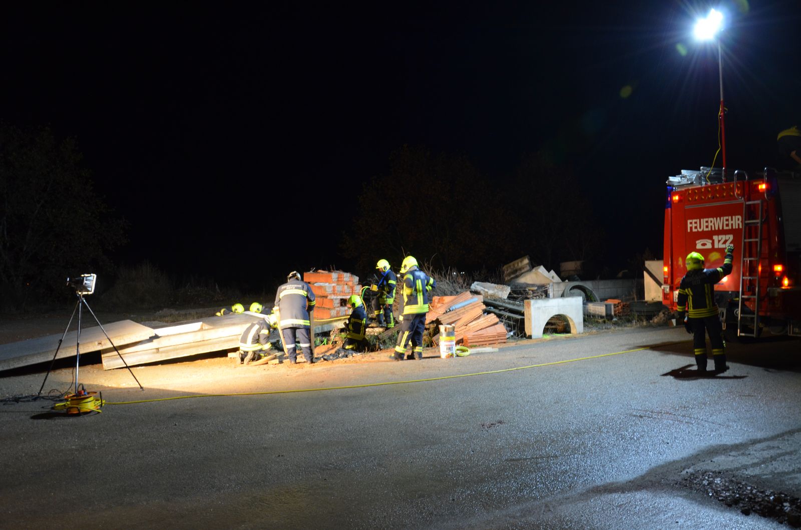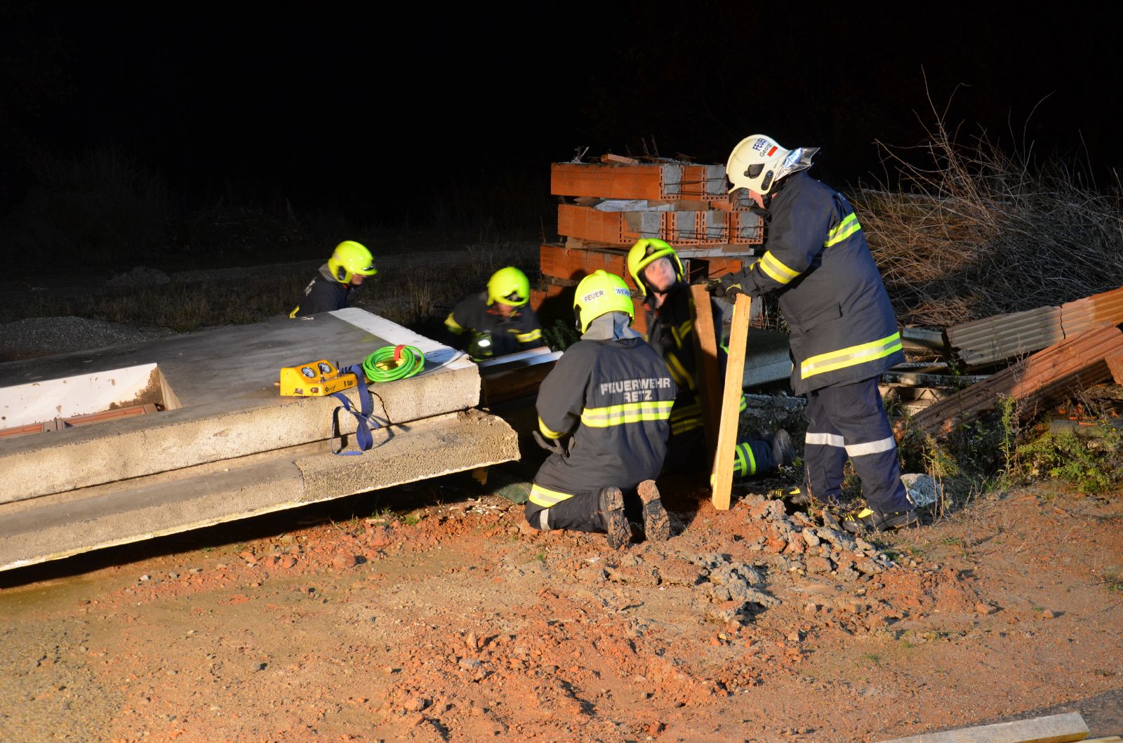 Als zweite Übungsannahme war eine Person unter Deckenelemente verschüttet. Auch hierbei wurde die Aufgabe der Rettung mittels Hebekissen und Pölz Holz bravourös erfüllt.