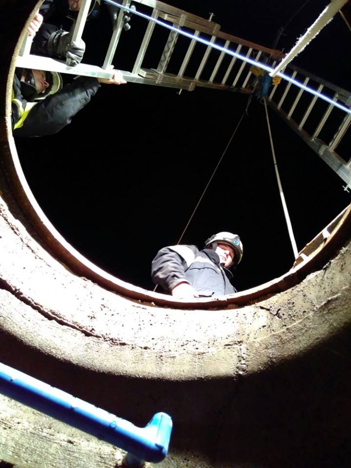 Hierzu wurden 3 Rundhölzer mit je 4m Länge zu einem Dreibein verbunden. Eine Umlenkrolle wurde an der Dreibeinspitze eingehängt. Eine Kameradin rüstet sich mit 5 Punkt Gurt und Rettungstuch aus und wurde in den Schacht abgelassen. Anschließend wurde dem Verletzten das Rettungsmittel angelegt und dieser vorsichtig hochgezogen. Nach erfolgreicher Rettung wurden weitere Maßnahmen bis zum Eintreffen vom Notarzt andiskutiert.