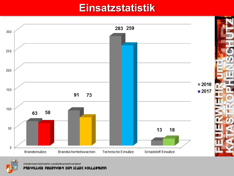 Im Jahr 2017 wurden die Mitglieder der Feuerwehr Hollabrunn zu insgesamt 408 Einsätzen alarmiert. In 22 Fällen konnten Personen gerettet und deren Notlagen abgewendet werden. Mit knapp 20.000 freiwillig geleisteten Stunden investierten die Freiwilligen Mitglieder einen großen sozialen Beitrag einem funktionierenden gesellschaftlichen Zusammenleben in unserer schönen Stadt Hollabrunn.