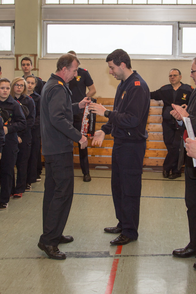 Vizebürgermeister Florian Hinteregger und Feuerwehrjugend-Hauptsponsor Franz Dastl erhielten eine Flasche Floriani-Wein für Ihre Bemühungen rund um den Wissenstest.