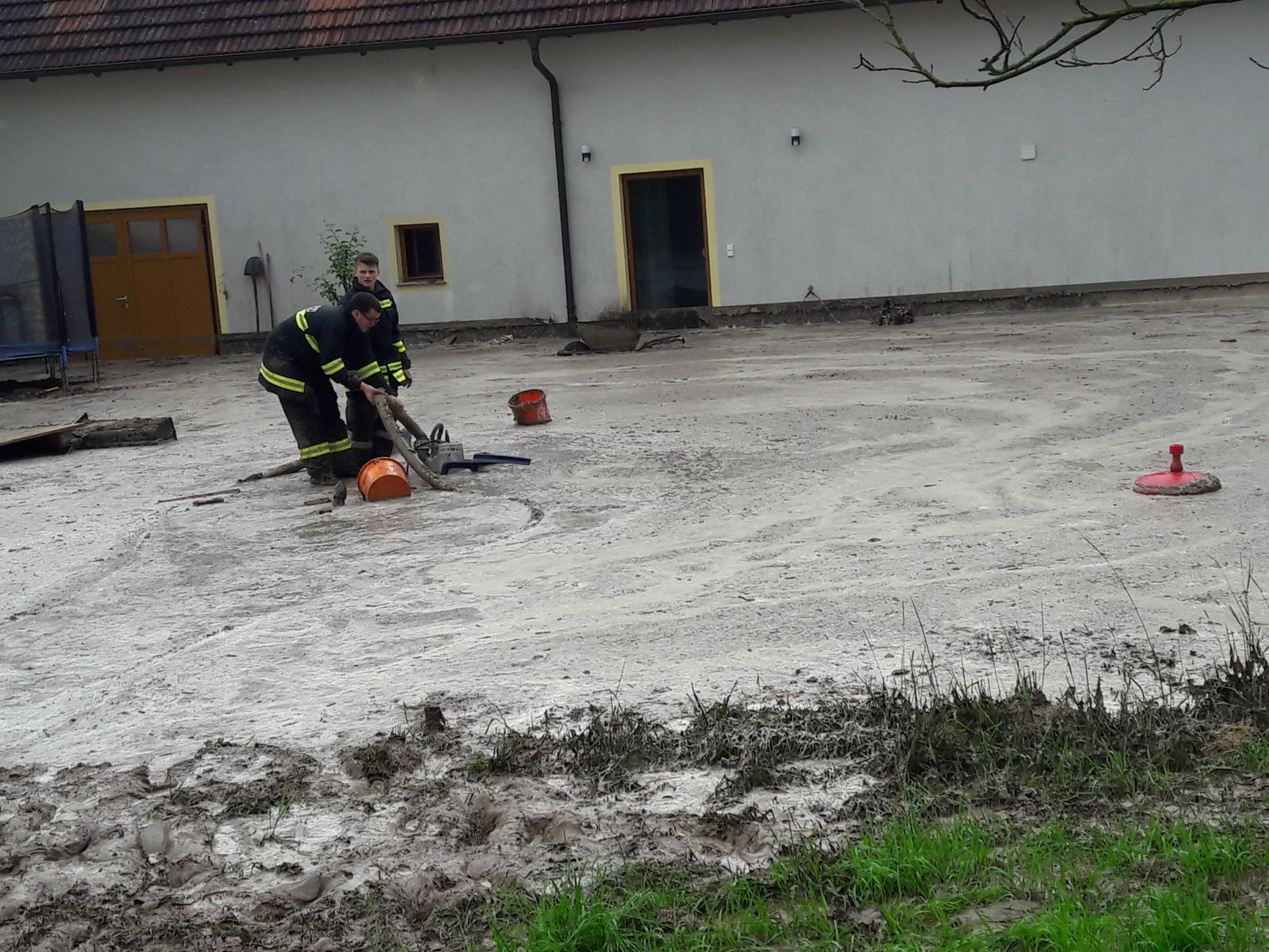 Zur Unterstützung wurden die von einem Einsatz zurückkommende FF Maissau und die FF Minichhofen nachalarmiert. Während der Auspump- und Aufräumarbeiten spitzte sich die Lage bei einem Wohnhaus gefährlich zu. Schlammmassen drückten in Hanglage gegen die Rückseite des Hauses. Der zähflüssige Schlamm konnte durch die Hausabflussrohre nicht mehr abfließen, türmte sich auf und es drohte die Zerstörung von erst kürzlich abgeschlossenen Umbauarbeiten am Haus. Mit dem Stromaggregat der kurz zuvor eingetroffenen FF Maissau, die bereits zur Aufräumarbeiten an der L48 im Ortsgebiet eingeteilt war, bereitgestellten Pumpen des Wasserbaus und der zeitgleich eintreffenden FF Ravelsbach konnte mit einem Großaufgebot an Einsatzkräften der Eintritt in die Wohnbereiche verhindert werden.