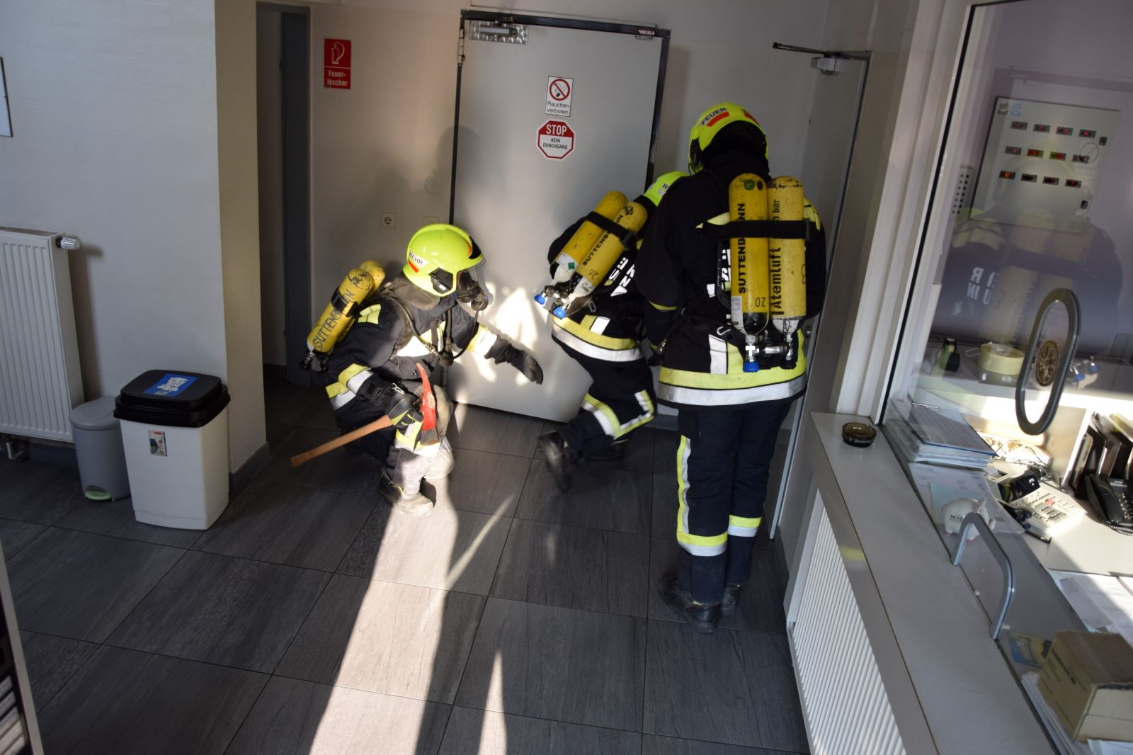 Sofort begann der Atemschutztrupp mit der Durchsuchung der Halle. Schon kurze Zeit später konnte die Person gefunden und in Sicherheit gebracht werden.