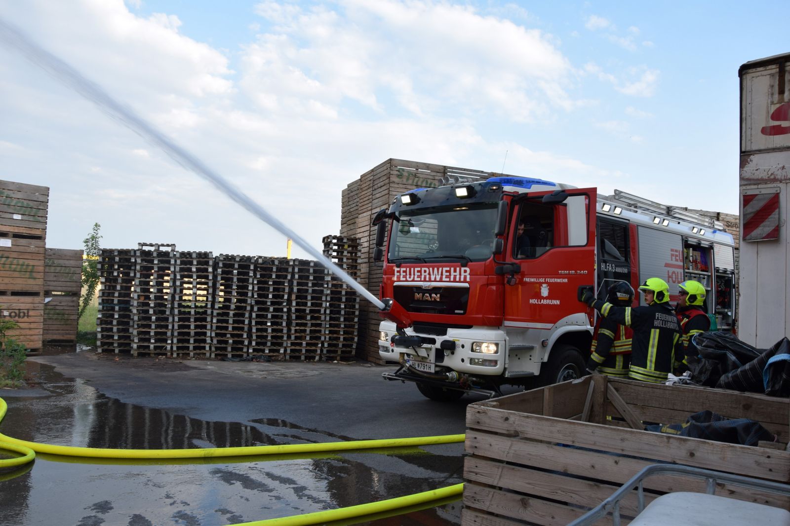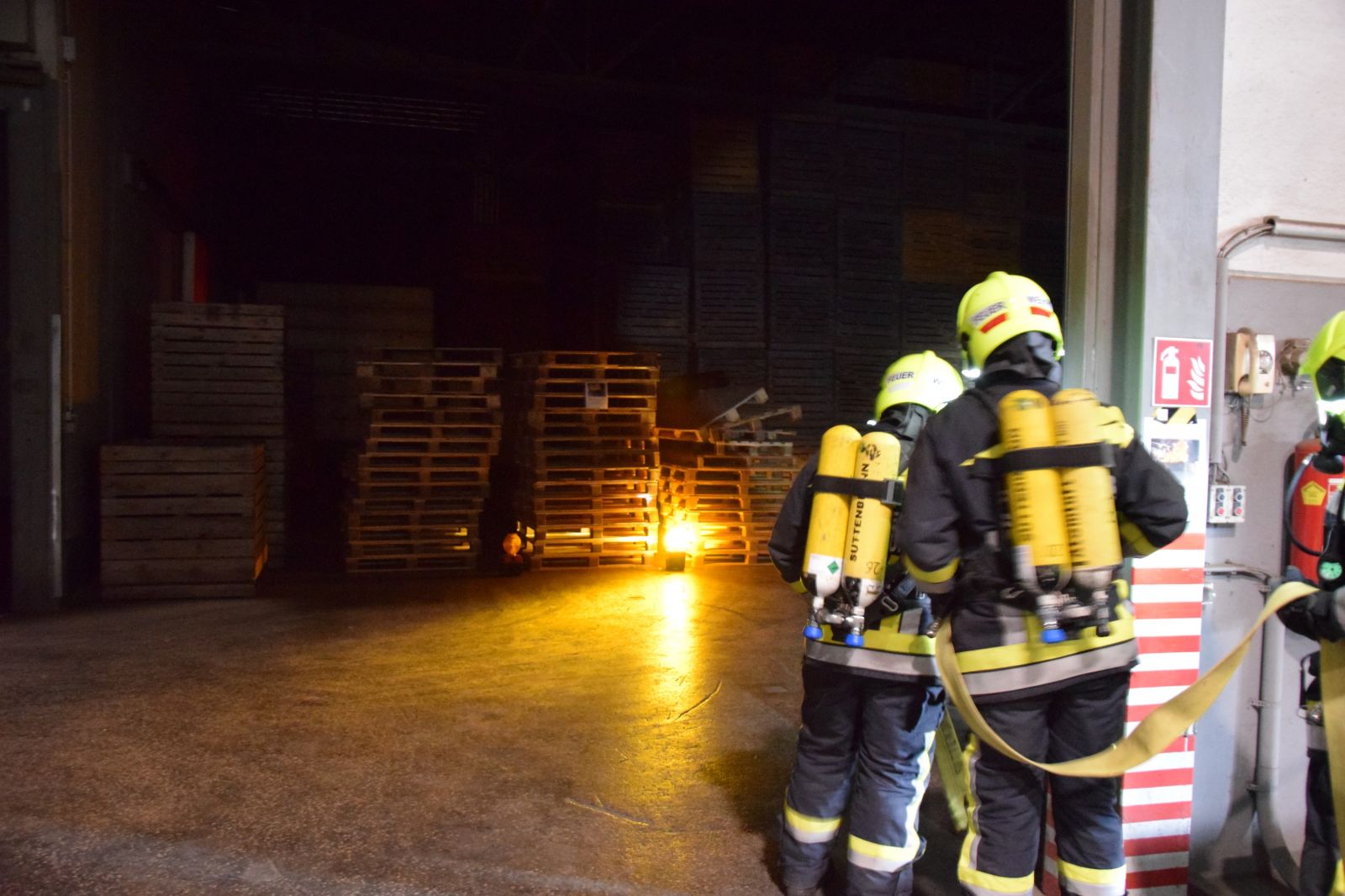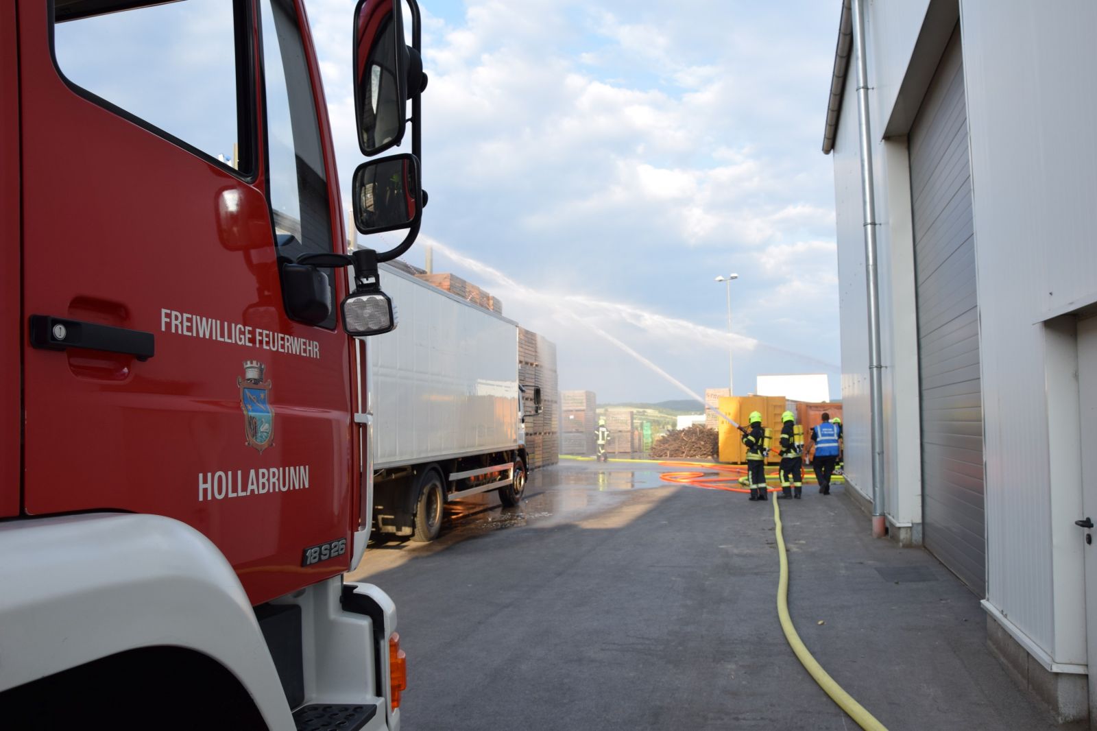 Gleichzeitig wurde ein Atemschutztrupp in das Innere des Gebäudes geschickt, um einen weiteren Zugang zu schaffen und mit einer Löschleitung eine Erkundung zu ermöglichen. Der erste Atemschutztrupp berichtete, dass ein Stapler in Brand geraten ist und die Flammen in weiterer Folge auf die Holzkisten in diesem Bereich übergegriffen haben. Nach dem Eintreffen weiterer Kräfte wurde das HLF3 der FF Hollabrunn in Stellung gebracht, um mit dem Frontwerfer und 2 C – Rohren den Brand zu bekämpfen und eine weitere Ausbreitung zu verhindern.