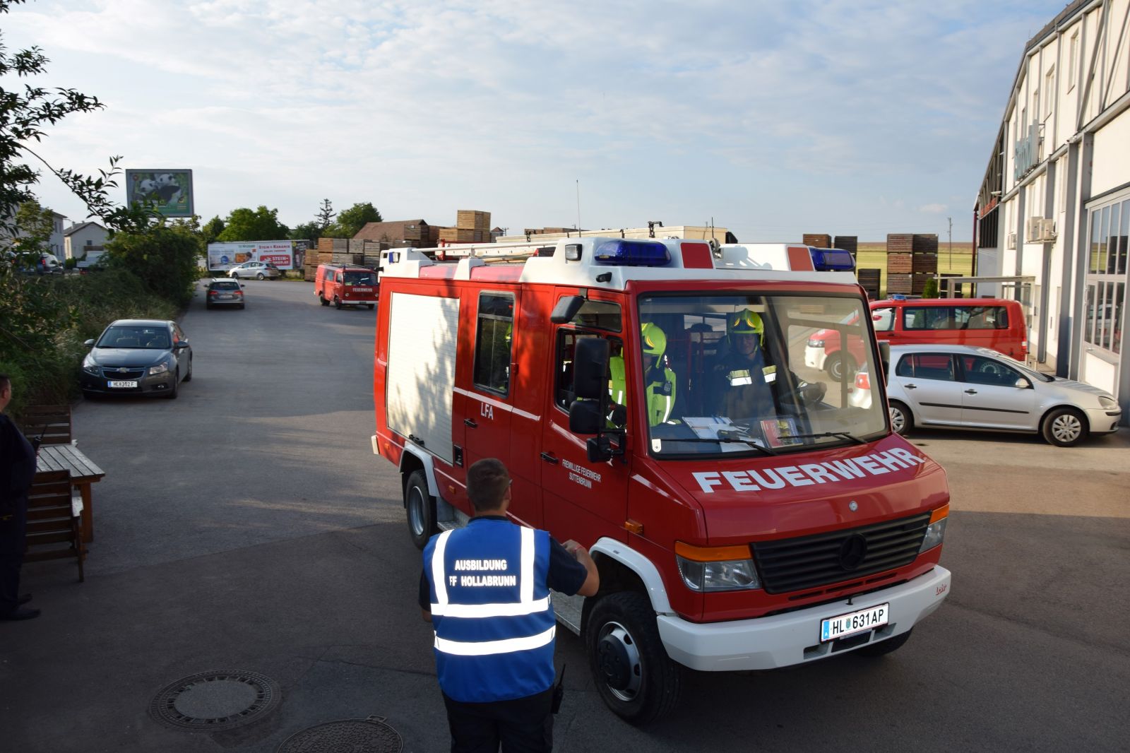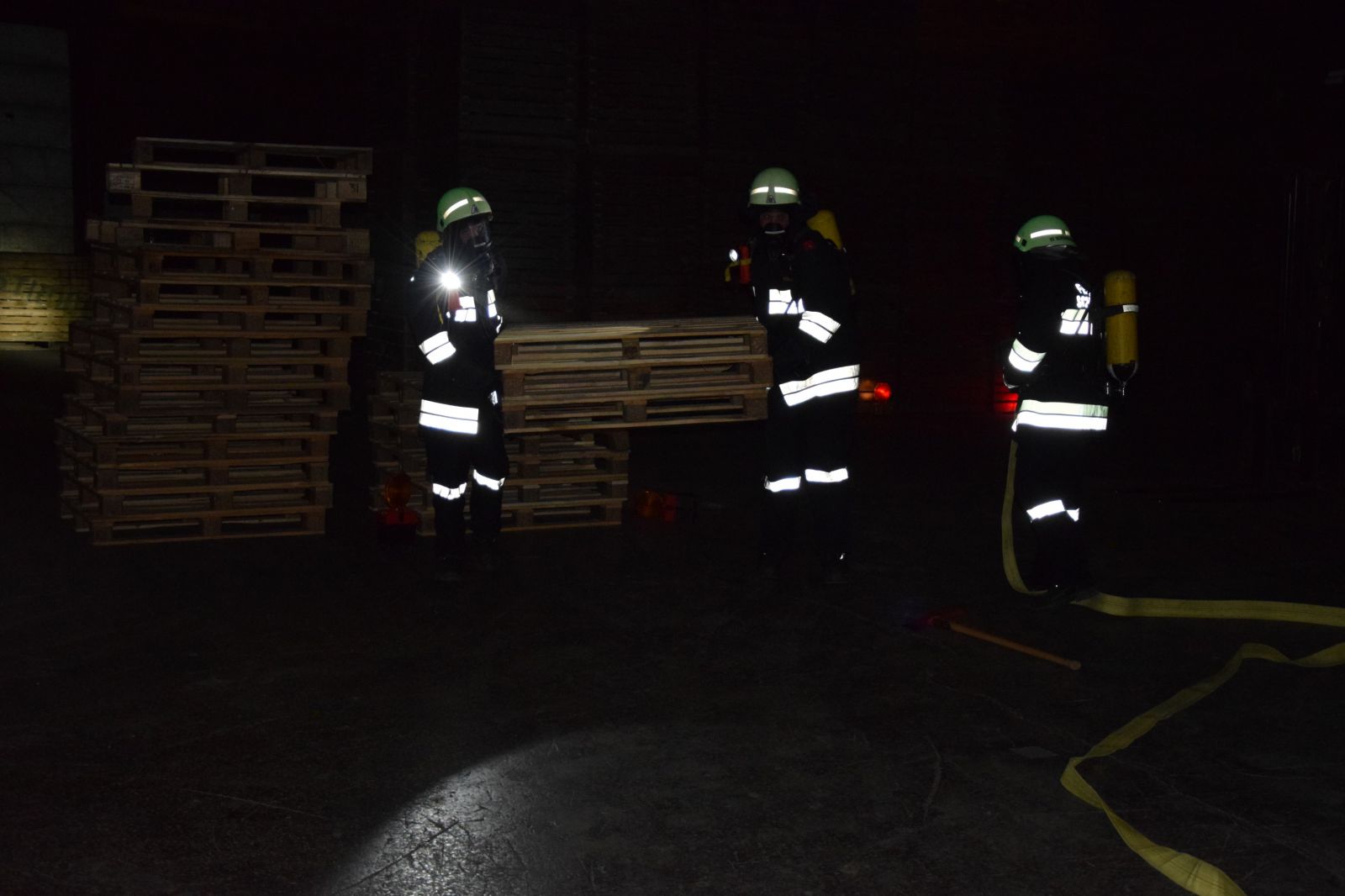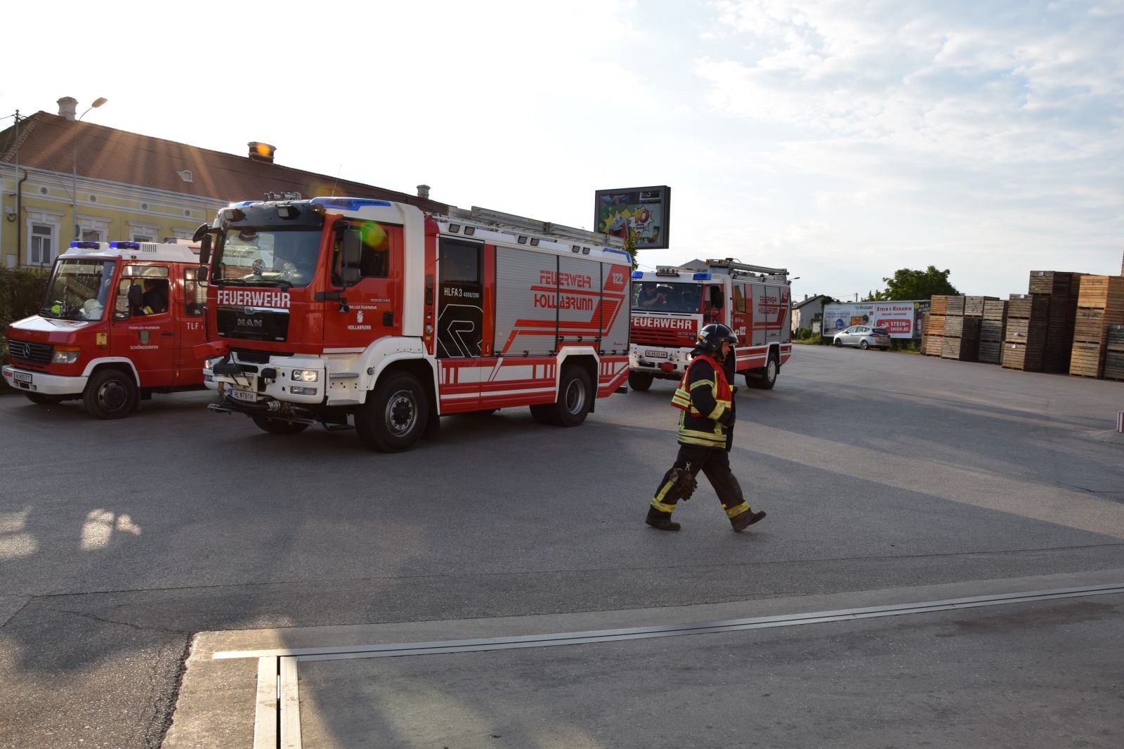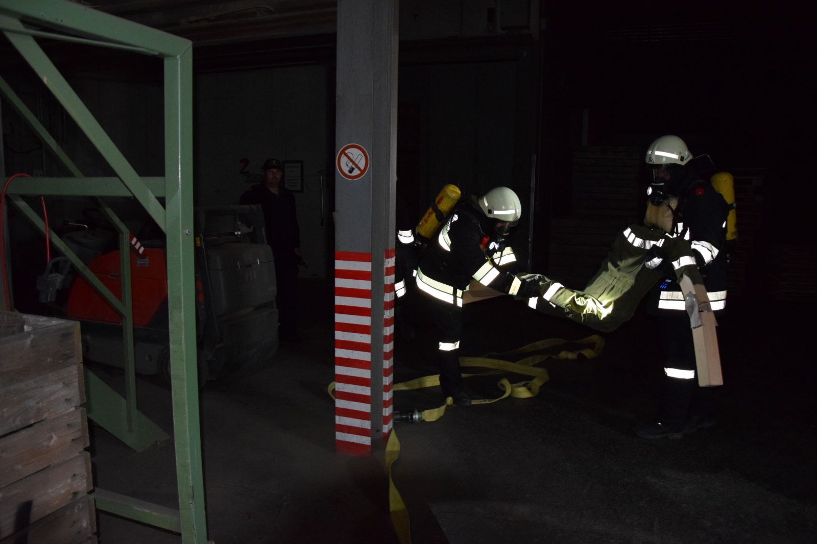 Gleichzeitig wurde ein Atemschutztrupp in das Innere des Gebäudes geschickt, um einen weiteren Zugang zu schaffen und mit einer Löschleitung eine Erkundung zu ermöglichen. Der erste Atemschutztrupp berichtete, dass ein Stapler in Brand geraten ist und die Flammen in weiterer Folge auf die Holzkisten in diesem Bereich übergegriffen haben. Nach dem Eintreffen weiterer Kräfte wurde das HLF3 der FF Hollabrunn in Stellung gebracht, um mit dem Frontwerfer und 2 C – Rohren den Brand zu bekämpfen und eine weitere Ausbreitung zu verhindern.