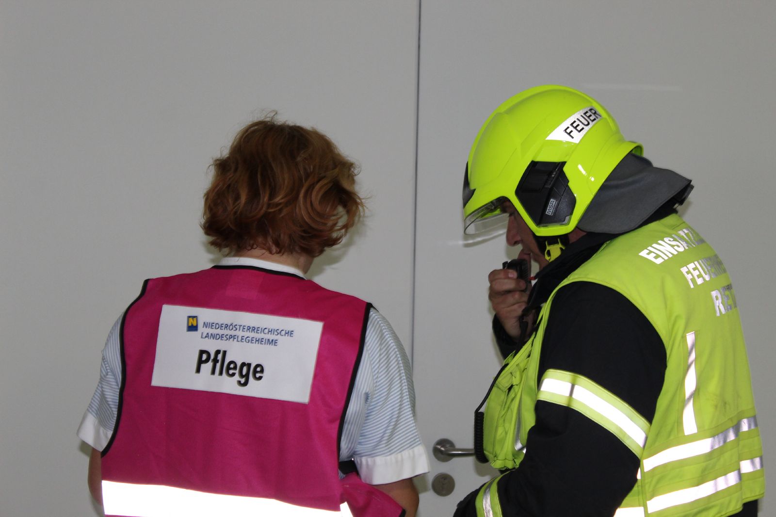 Nach der Erkundung durch den Übungsleiter mit einer betroffenen Pflegestation mit 9 Bewohnern in der auch das Brandzimmer liegt, ist der gesamte Bereich stark verraucht und auf Grund der Lage wird der Unterabschnitt Retz nachalarmiert.