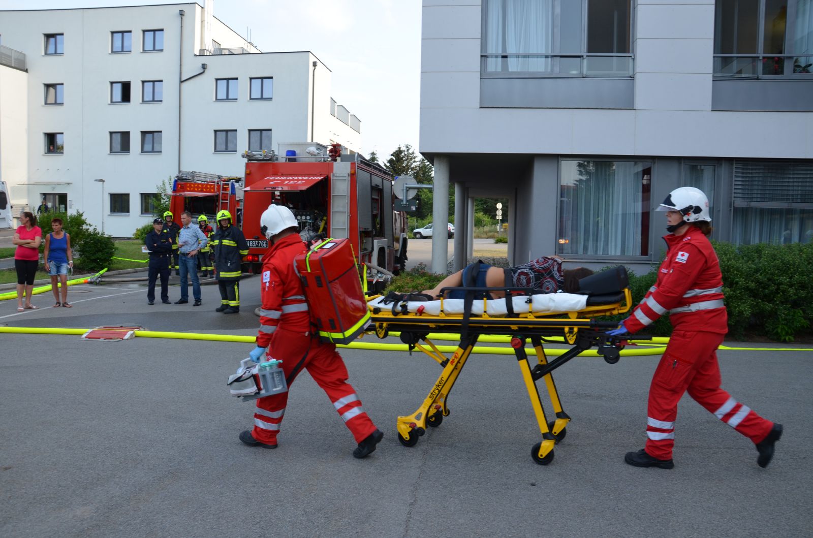 Die Übungsannahme war, dass in einem Bewohnerzimmer im 2. Obergeschoss ein Brand ausbricht. Die Brandmeldeanlage schlägt an und die FF Retz wird zu einem TUS Alarm alarmiert.