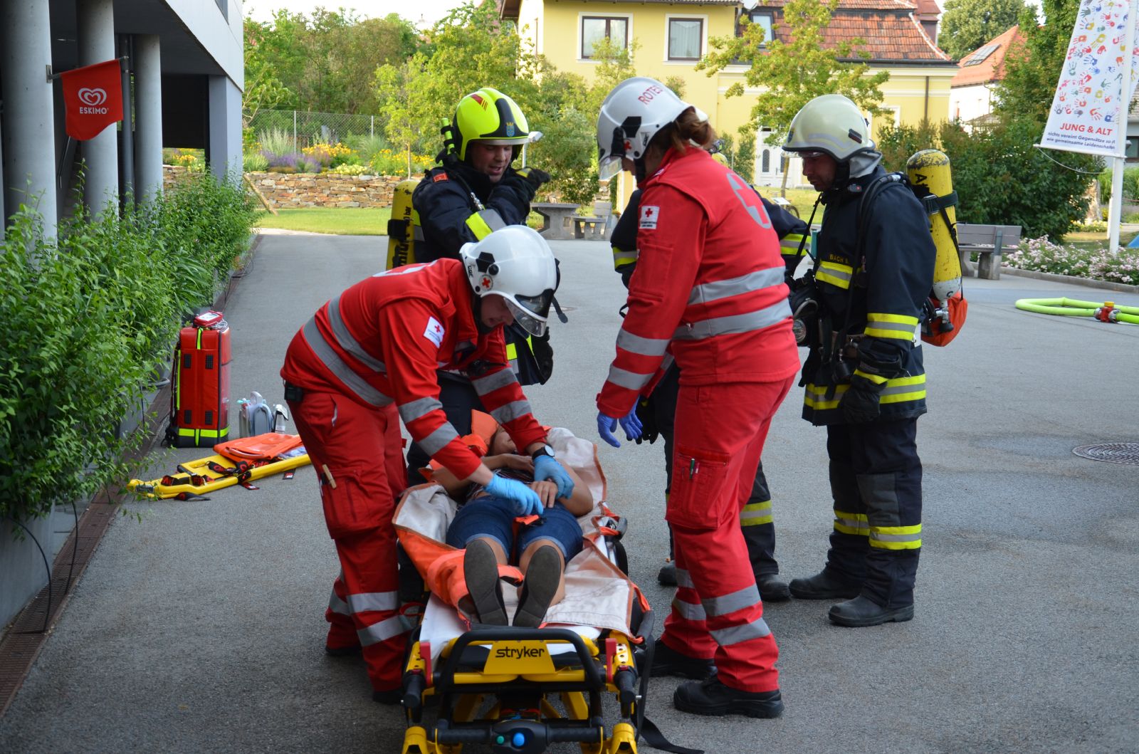Insgesamt wurden neun eingeschlossene Personen gerettet, diese vom 3. Stock mittels Atemschutz ins Freie gebracht und den Rettungskräften übergeben.