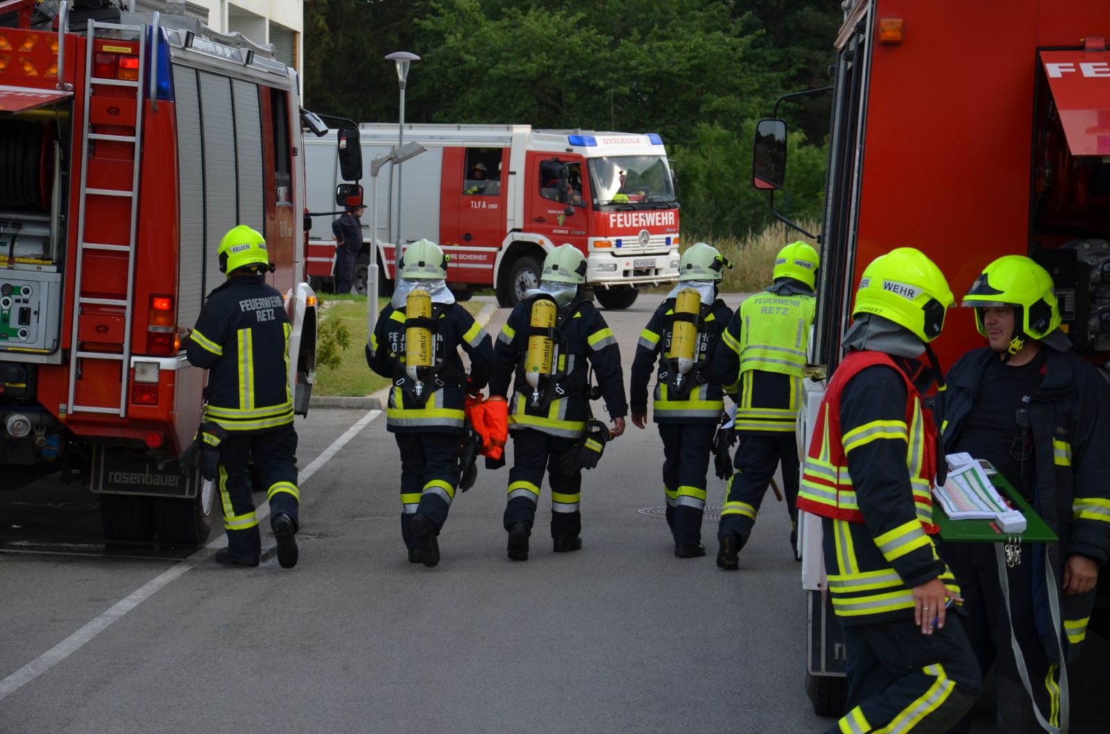 Die in der Zwischenzeit eintreffenden Feuerwehren aus dem Unterabschnitt Retz übernahmen mit der FF Retz die Menschenrettung aus der Pflegestation und die weiter Brandbekämpfung vom Inneren.