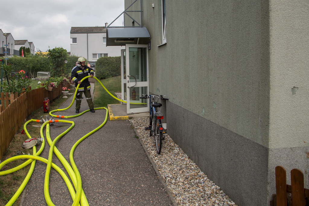 Beim Eintreffen von Einsatzleiter Florian Bauer informierten die Bewohner über einen Küchenbrand im Obergeschoss. Zusätzlich wurde der Einsatzleiter der Feuerwehr darüber informierte, dass eine Person mit „Gipsfuss“ das Haus nicht rechtzeitig verlassen konnte. Umgehend wurde zwei Feuerwehrmitglieder zur Betreuung der Person losgeschickt und hielten sich bereit den Bewohner zu retten. Der bereits fertig ausgerüstete Atemschutztrupp konnte umgehend in den Innenangriff gehen und den Brand jedoch rasch unter Kontrolle bringen.