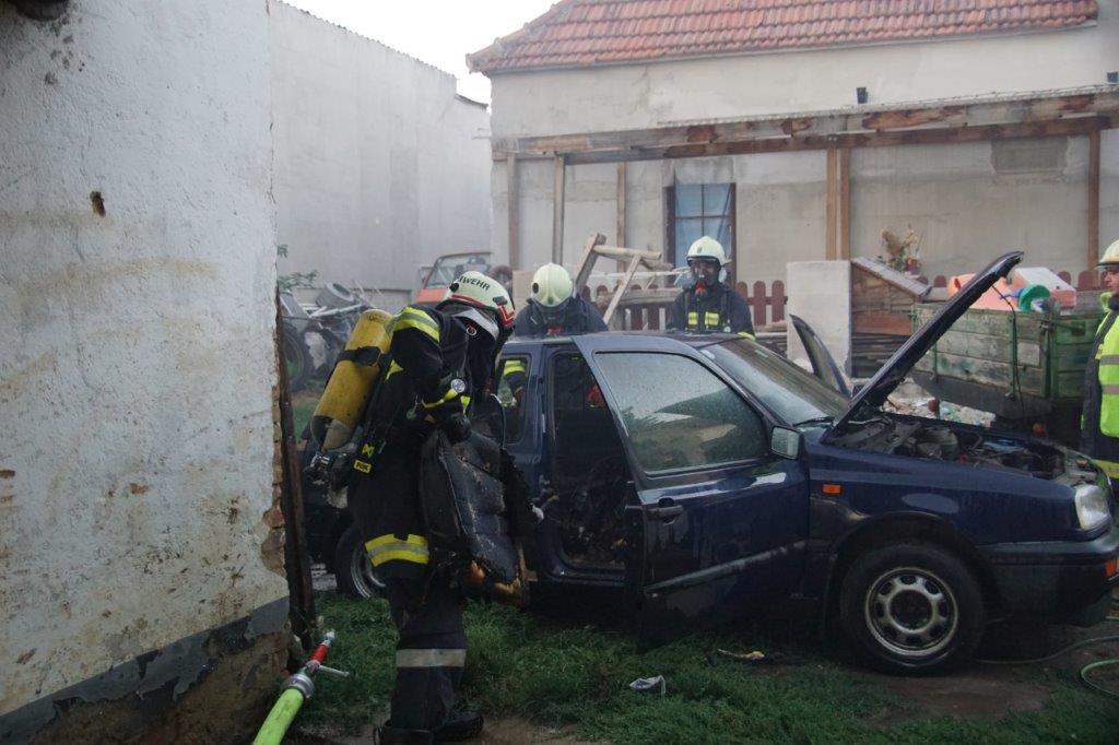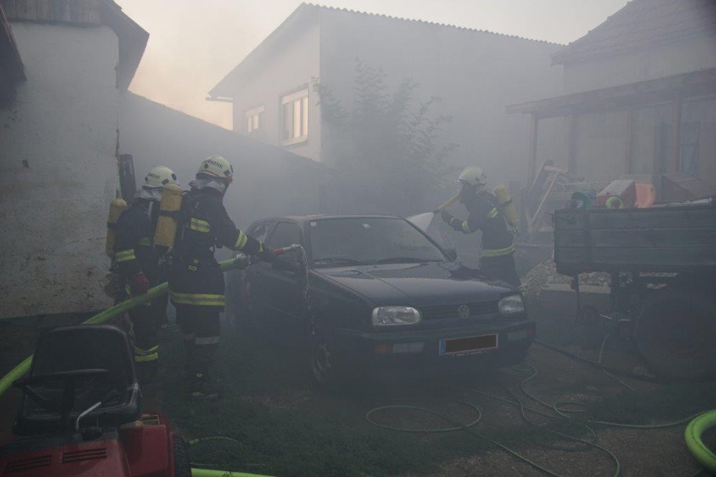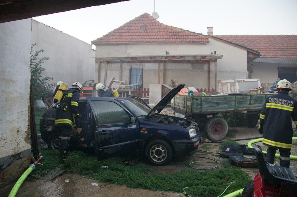 Nach Eintreffen der FF Unternalb wurde rasch klar das es sich um einen Fahrzeugbrand im Hof eines Grundstückes handelte. Die alarmierten Einsatzkräfte begannen umgehend unter schwerem Atemschutz mit den Löscharbeiten. Zwischenzeitlich traf auch die FF Retz zur Unterstützung ein.