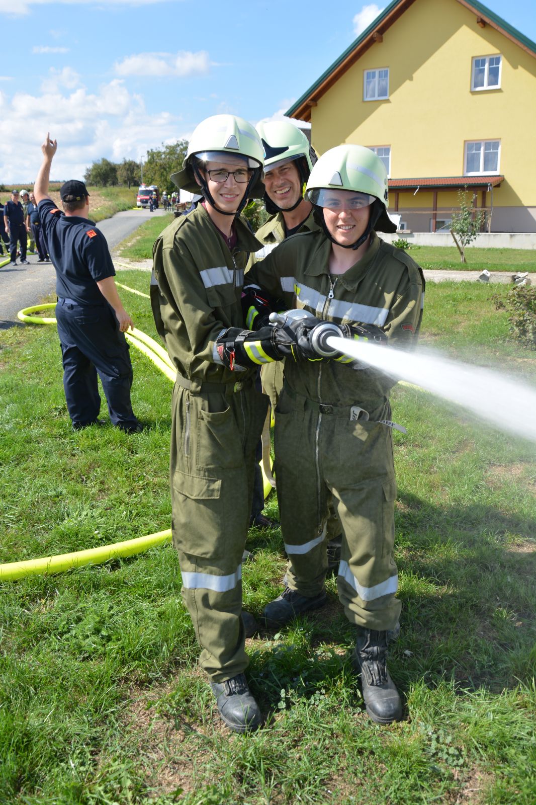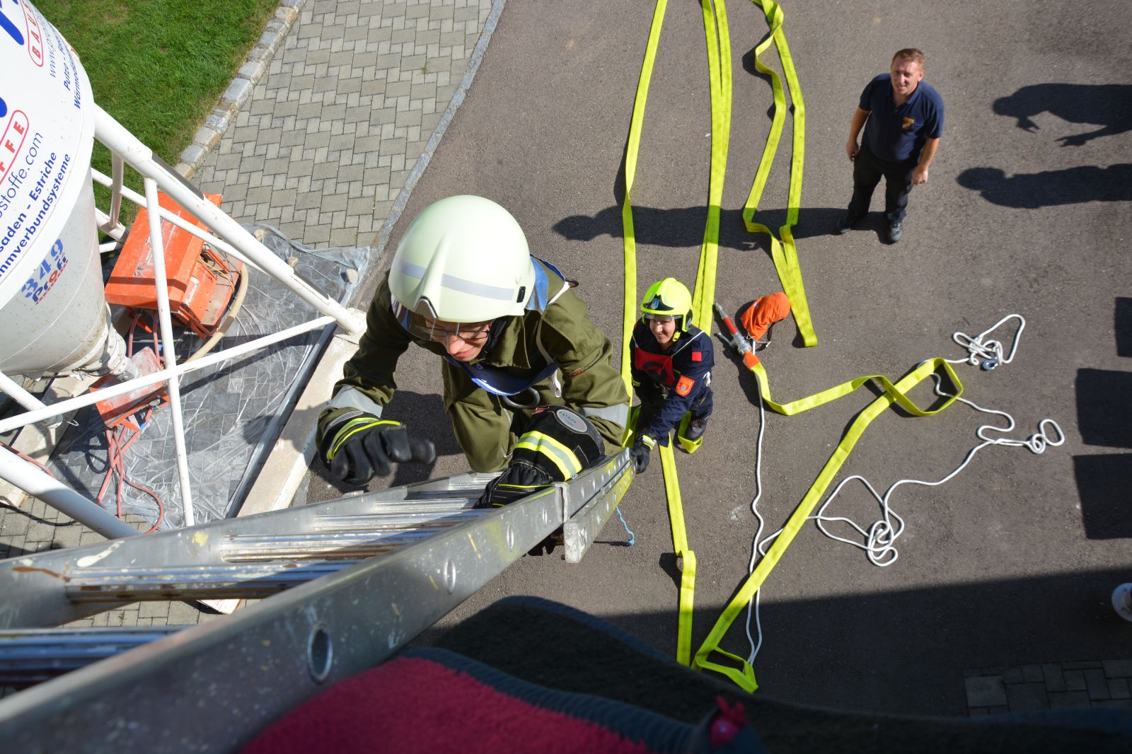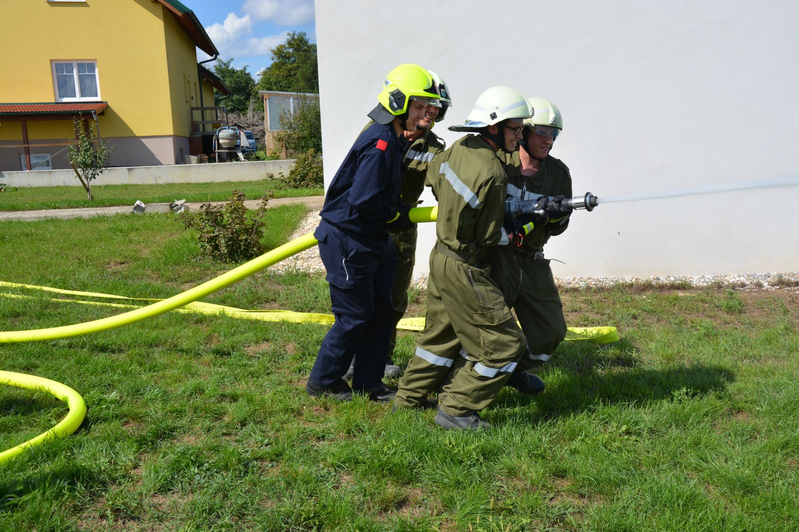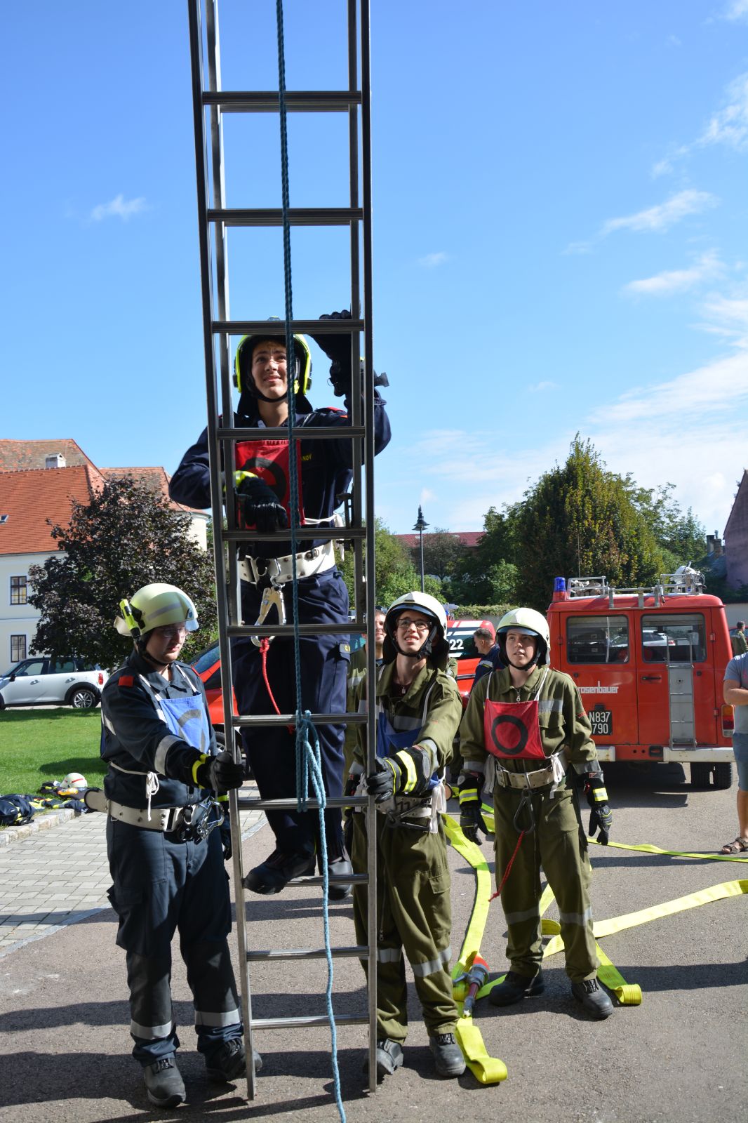 Der zweite Tag war ein Praxistag: *) Gruppe im Löscheinsatz (Saugstelle) *) Gruppe im Löscheinsatz (Löschangriff) *) Gruppe im Technischen Einsatz *) Arbeiten mit tragbaren Leitern