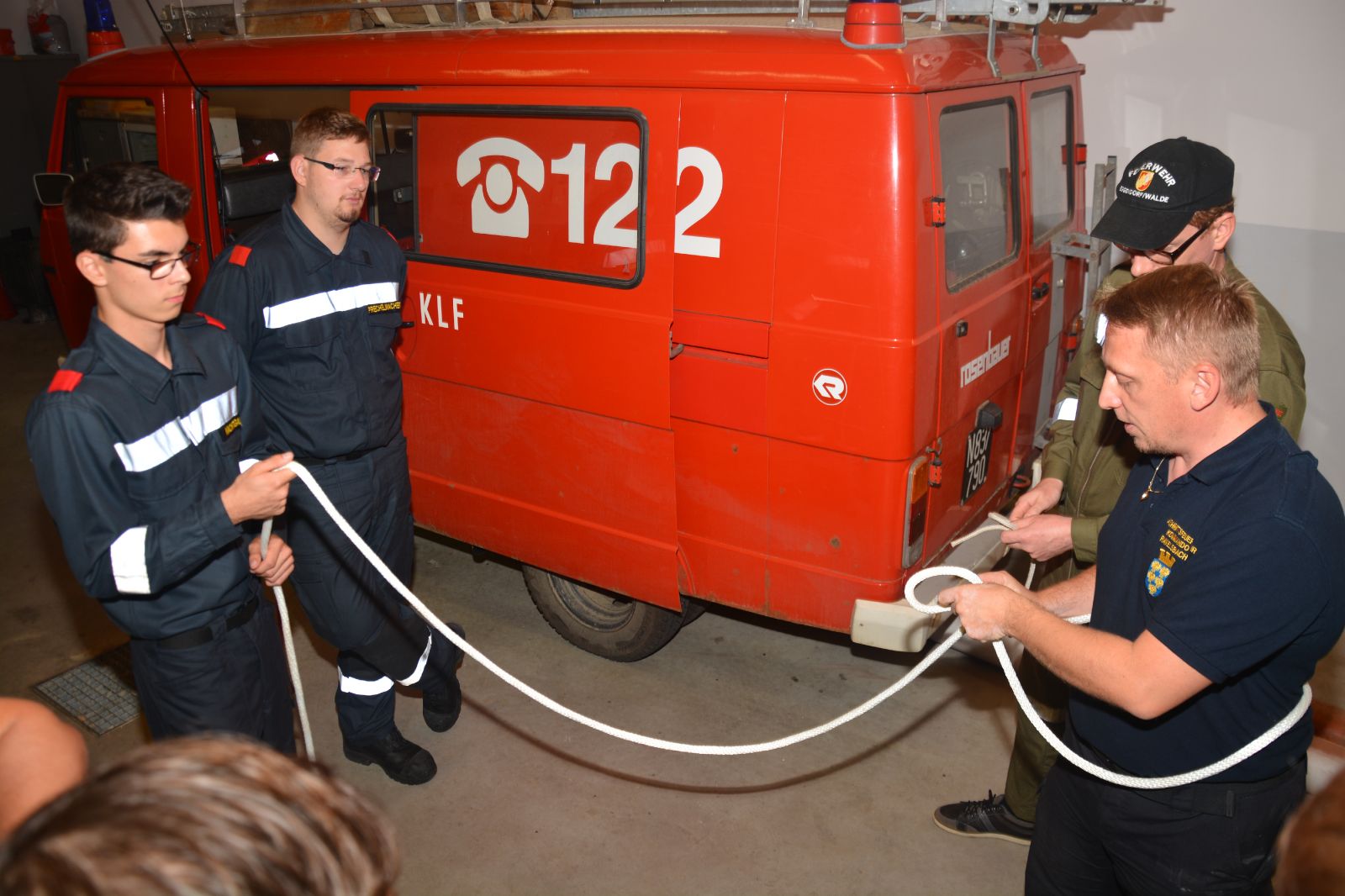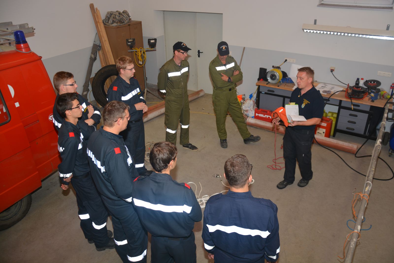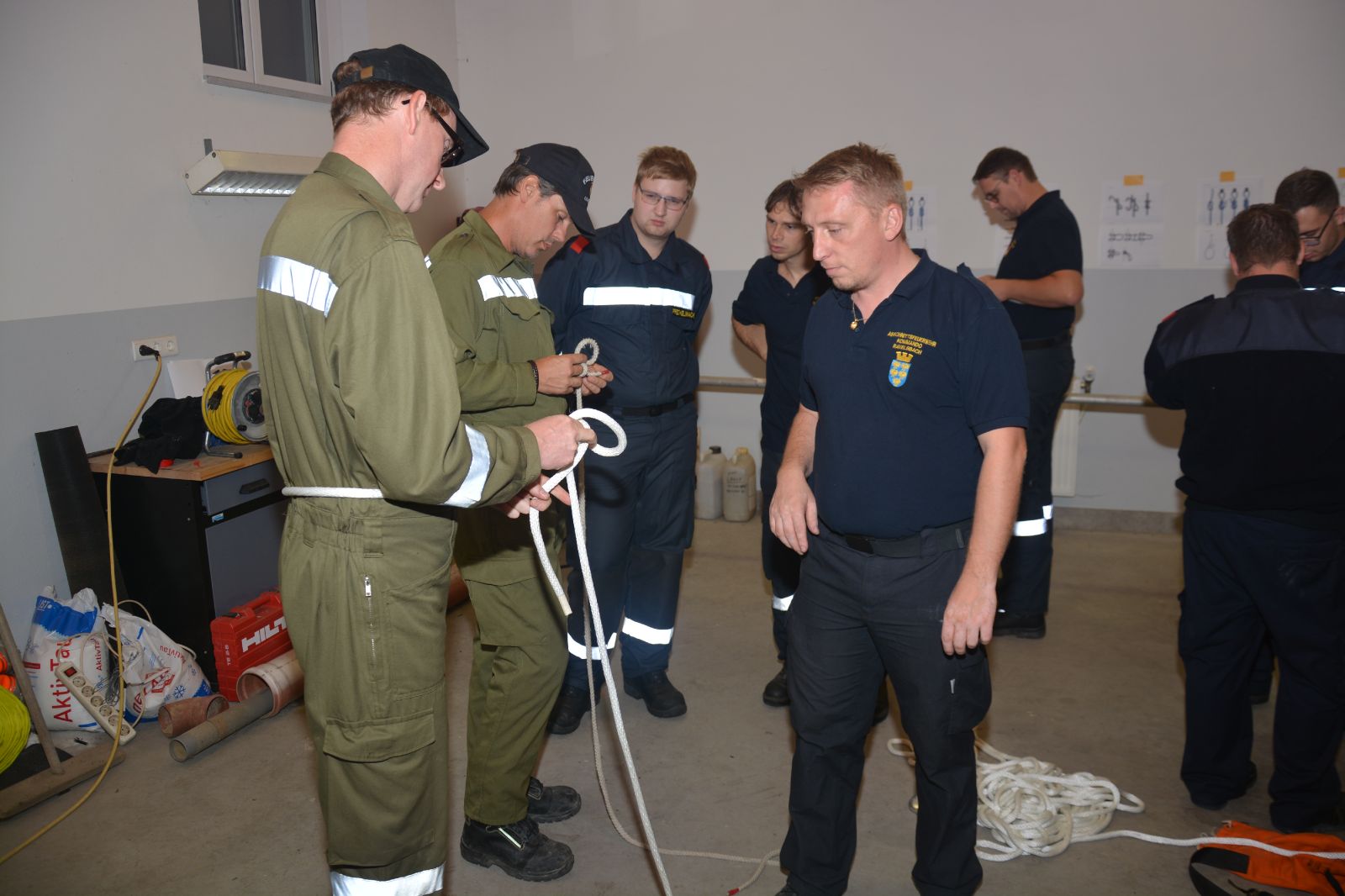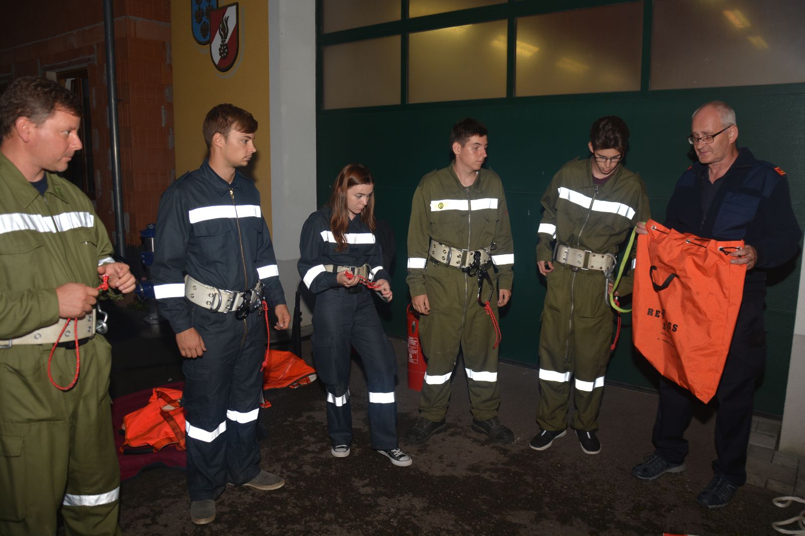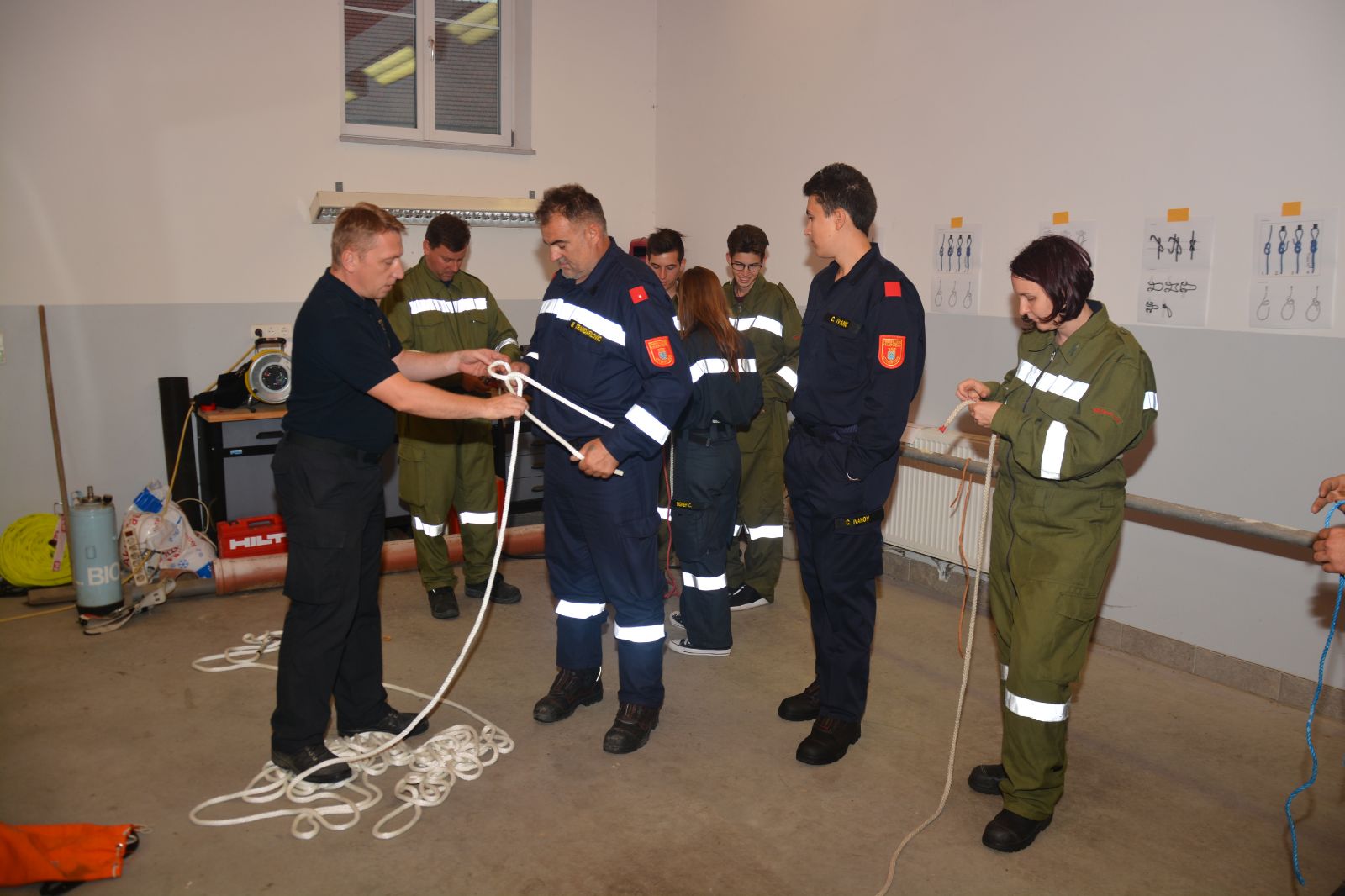 Am ersten Tag standen folgende Themen am Stundenplan *) Gefahren an der Einsatzstelle *) der Feuerwehreinsatz *) die Löschgruppe (Theorie) *) Verhalten vor der Gruppe *) Leinen, Knoten und Rettungsmittel *) Kleinlöschgeräte