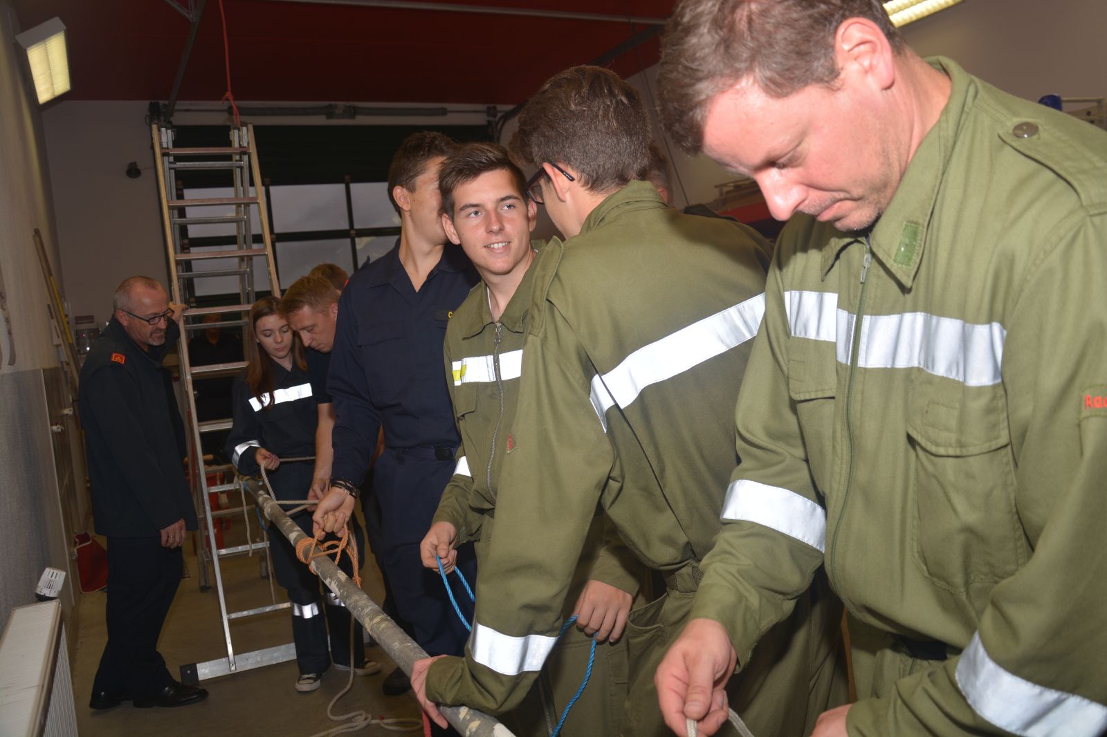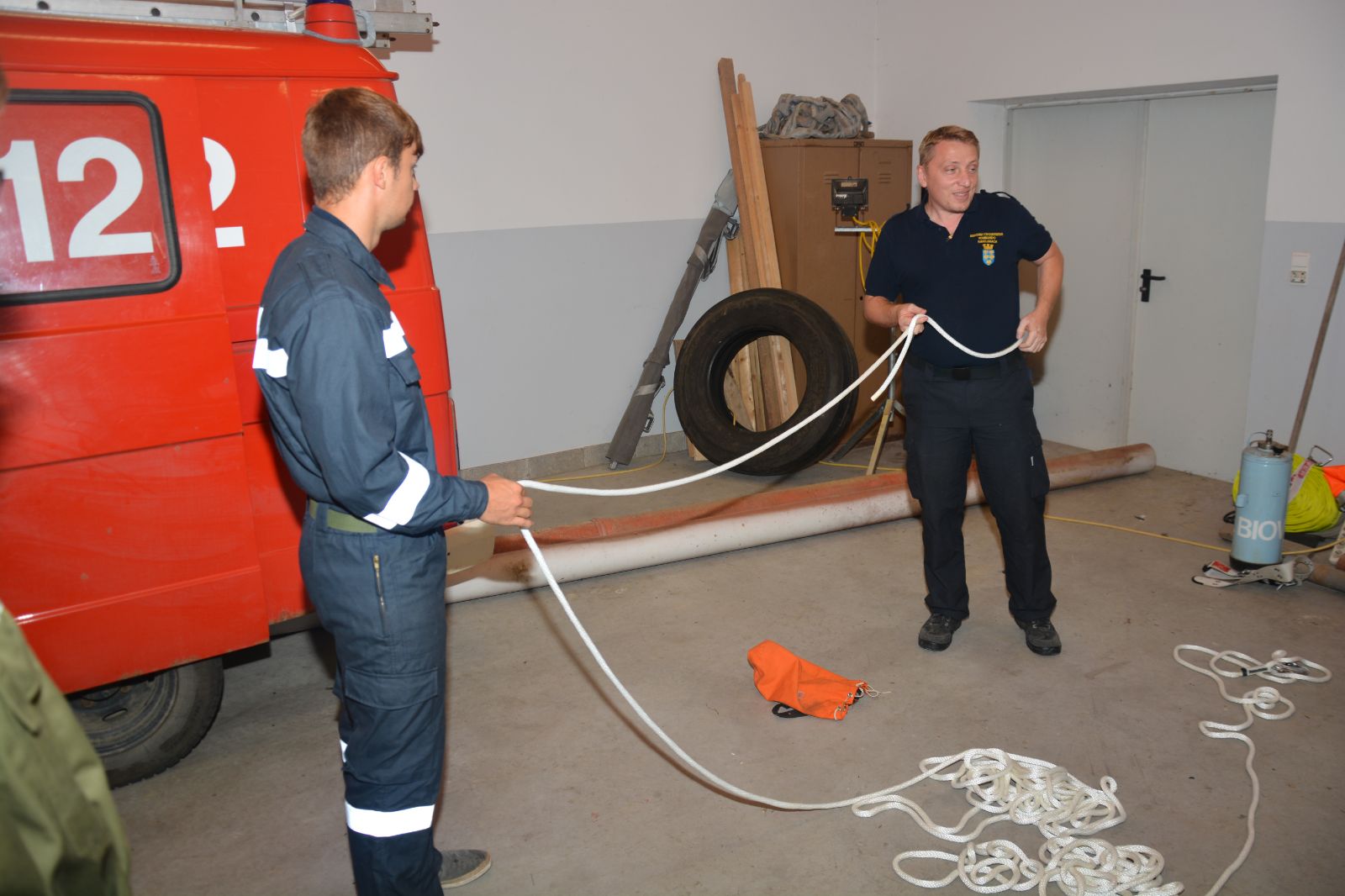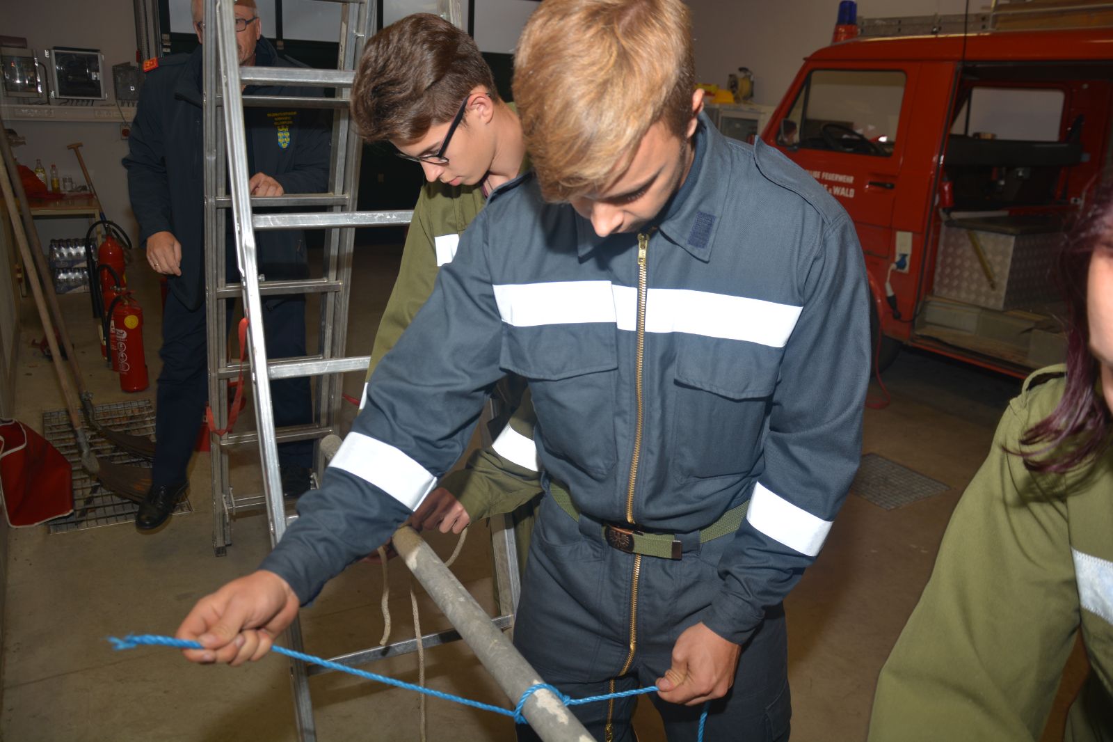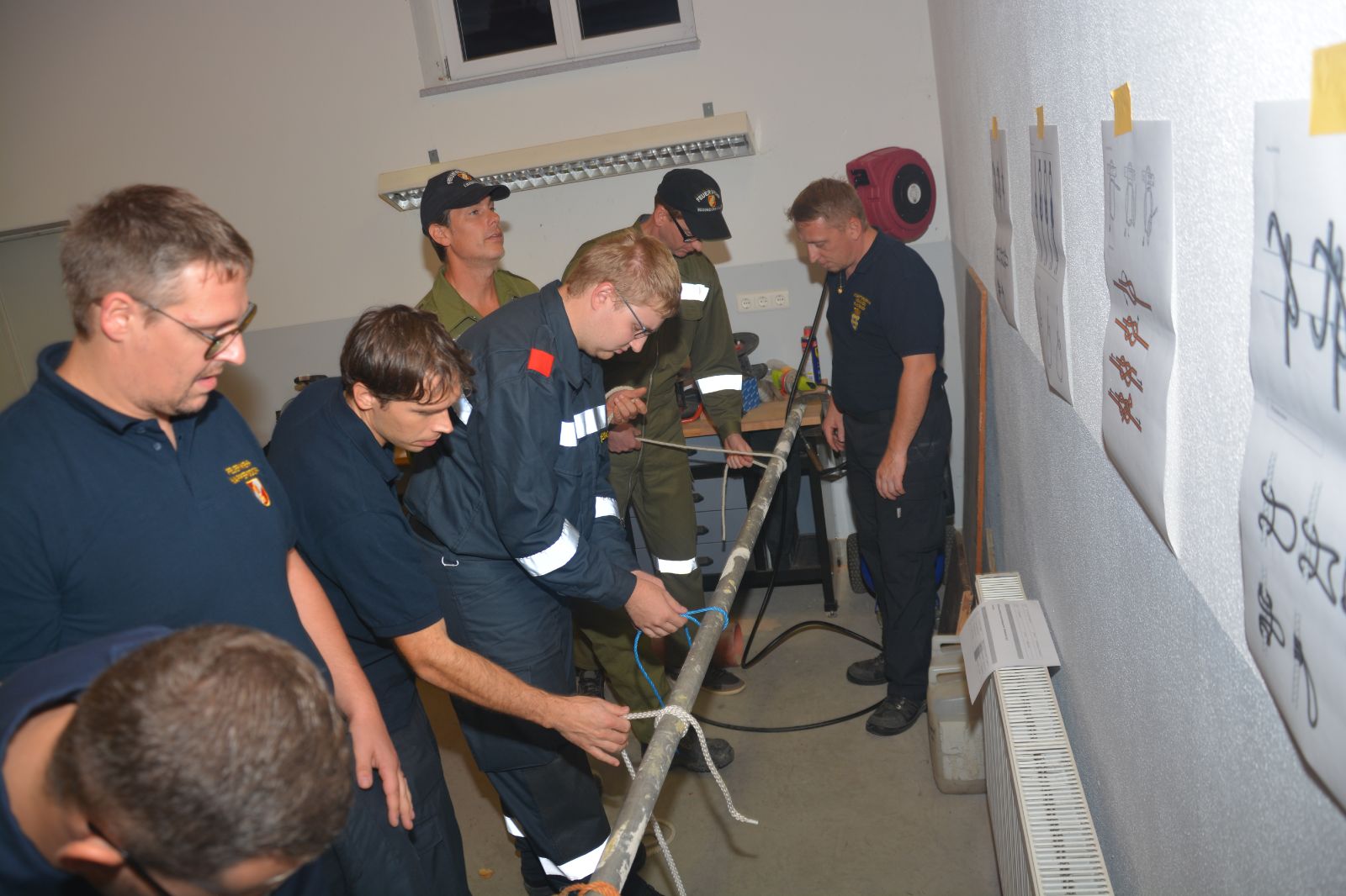 Am ersten Tag standen folgende Themen am Stundenplan *) Gefahren an der Einsatzstelle *) der Feuerwehreinsatz *) die Löschgruppe (Theorie) *) Verhalten vor der Gruppe *) Leinen, Knoten und Rettungsmittel *) Kleinlöschgeräte