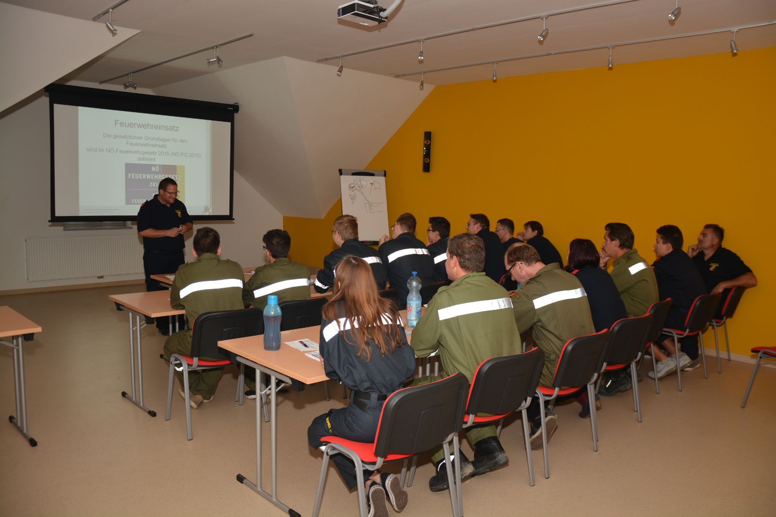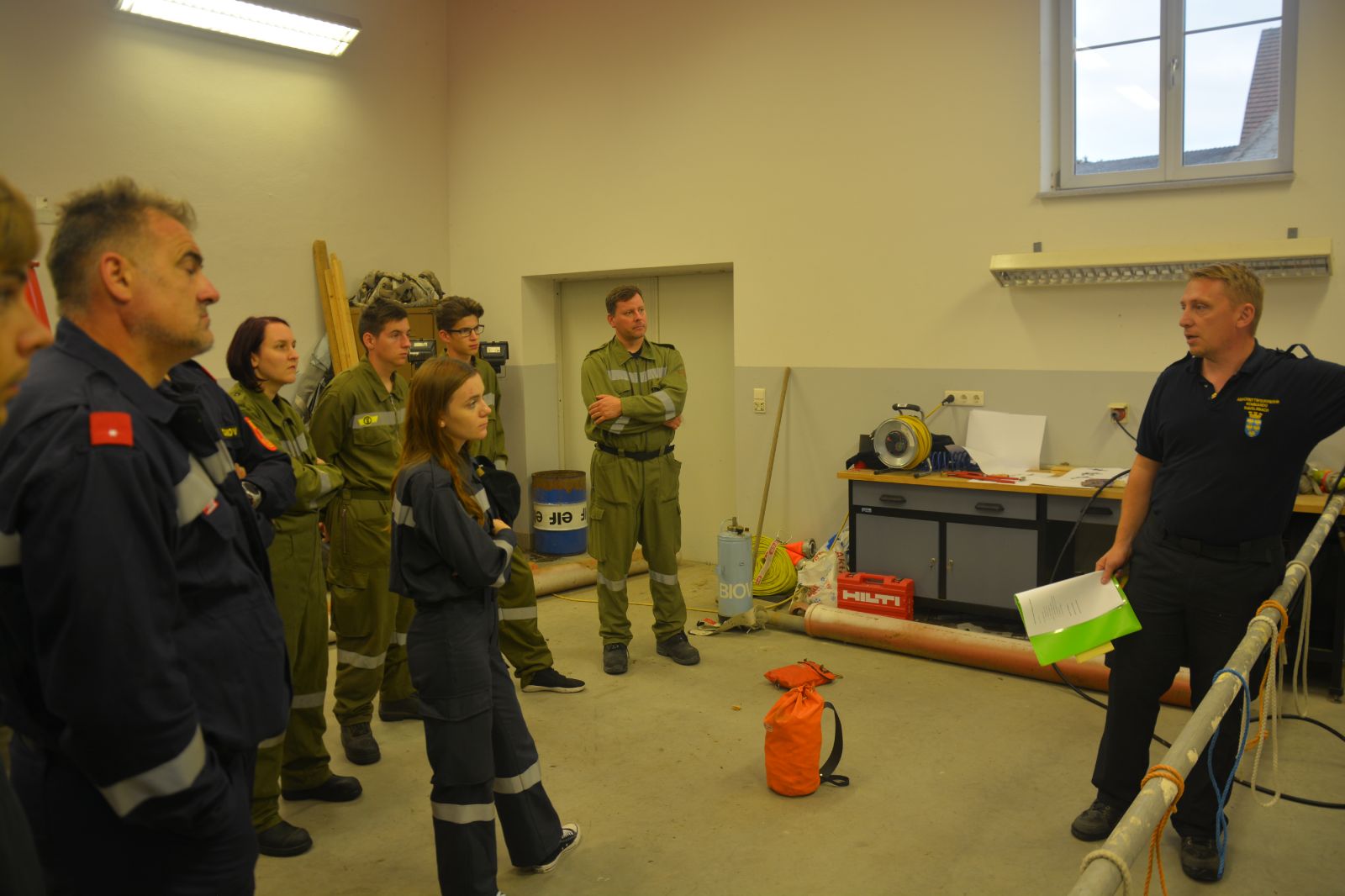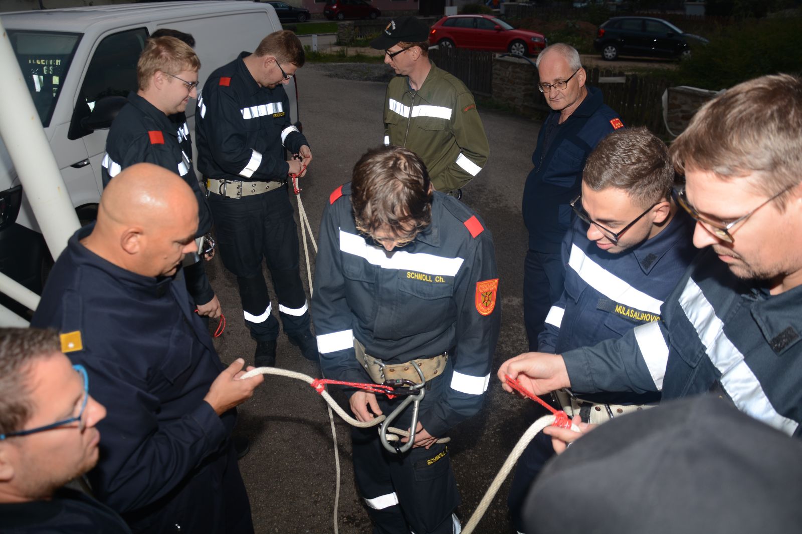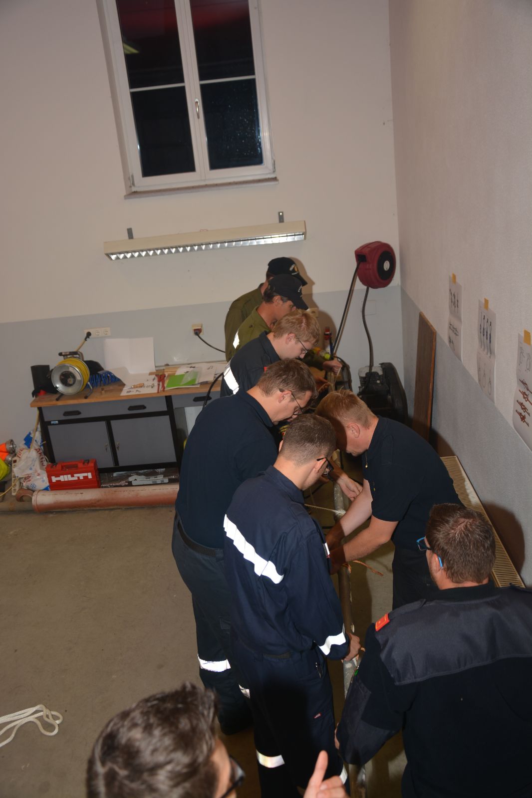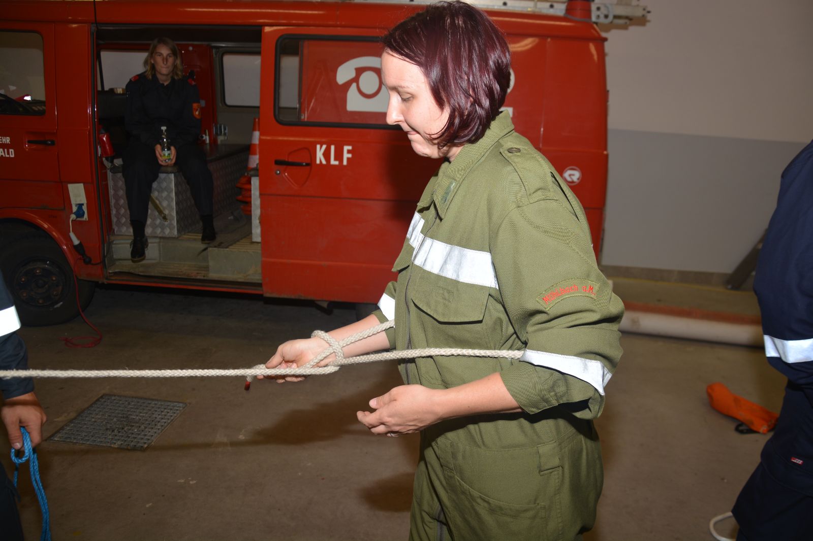 Am ersten Tag standen folgende Themen am Stundenplan *) Gefahren an der Einsatzstelle *) der Feuerwehreinsatz *) die Löschgruppe (Theorie) *) Verhalten vor der Gruppe *) Leinen, Knoten und Rettungsmittel *) Kleinlöschgeräte